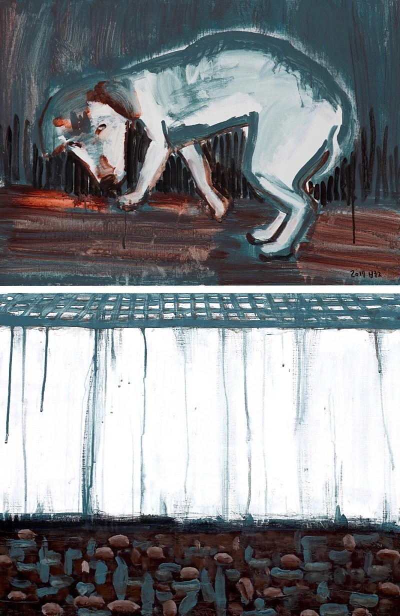 녀석들은 오물 범벅의 뜬장에 간신히 버티고 서서, (인간들의) 음식 찌꺼기를 받아먹고는 얼기설기 뜬장 아래의 똥 무더기 땅바닥으로 자신의 똥을 또다시 떨군다. (인간이) 녀석들을 꺼내 주지 않으면 똥 범벅 오물 범벅의 뜬장에서 (인간의) 먹잇감으로 도살되거나 죽어서야 나갈 수 있다. 많은 사람들은 그곳에 갇힌 녀석들을 구조하기 위해 고군분투한다. 뜬장에 가둔 것도 인간이고 꺼내려 애쓰는 것도 인간이다.