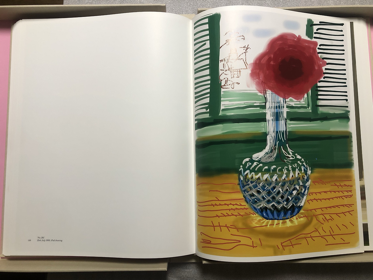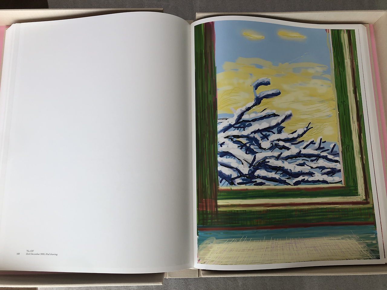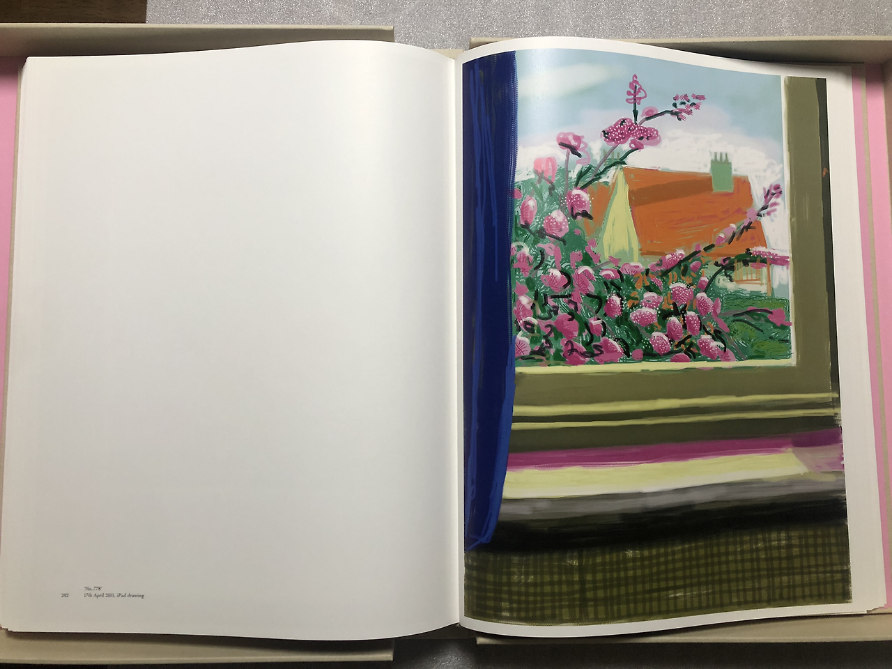 아들이 책의 가격을 듣더니, 침 안 튀게 마스크 끼고, 지문 안 묻게 장갑 끼고 넘겨 보라고 한다. (어디서 본건 있어서…) 이 책은 호크니 작가가 아이폰으로 드로잉을 시작한 2009년부터 아이패드로 작업한 2010-2012까지의 작품들이 실려있다. (책에 관한 좀 더 디테일한 내용은 천천히 업데이트할 예정이다.)