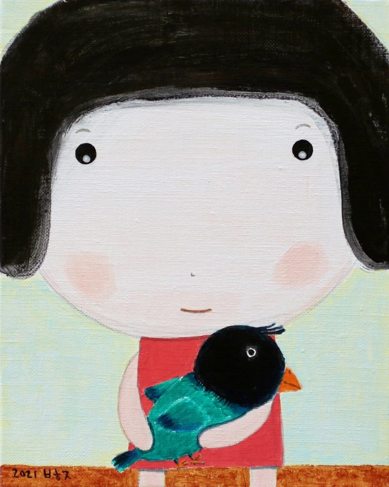 몸통 기본색은 ‘청녹 blue green’이고 목, 날개 끝 부분은 ‘코발트 블루 cobalt blue’ & ‘세루리안블루 cerulean blue’ 부리랑 다리는 ‘주황 vermilion’