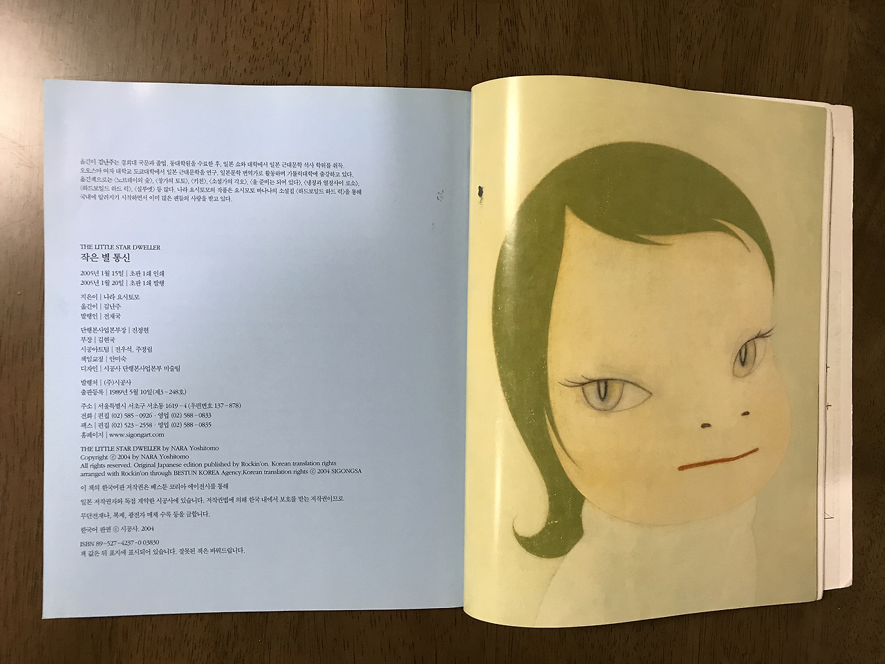 나라상은 본인의 인기가 많아지고 작품이 비싸지면서 (오래전에도 비쌌지만 2021 현재는 이 세상 가격이 아니다…;;) 경제력이 안 따라주는 (어린) 팬들을 위하여 티셔츠와 책, 프린트 등을 꾸준히 만들었다. 그중 내가 제일 처음으로 구매했던 ( 한국어로 번역된 ) 책은 요시토모 나라 ( 당시 44세 ) 한국 개인전 몇 달 앞서 펴 낸 ‘작은 별 통신’(시공사, 2005)이라는 책이다. 이 책은 작가가 1959년 태어나서부터 시간순으로, 여러 도시를 돌아다니며 작업하고 전시하는 공간별로 정리가 되어있다. 40중반 화가의 자서전인 셈이다.