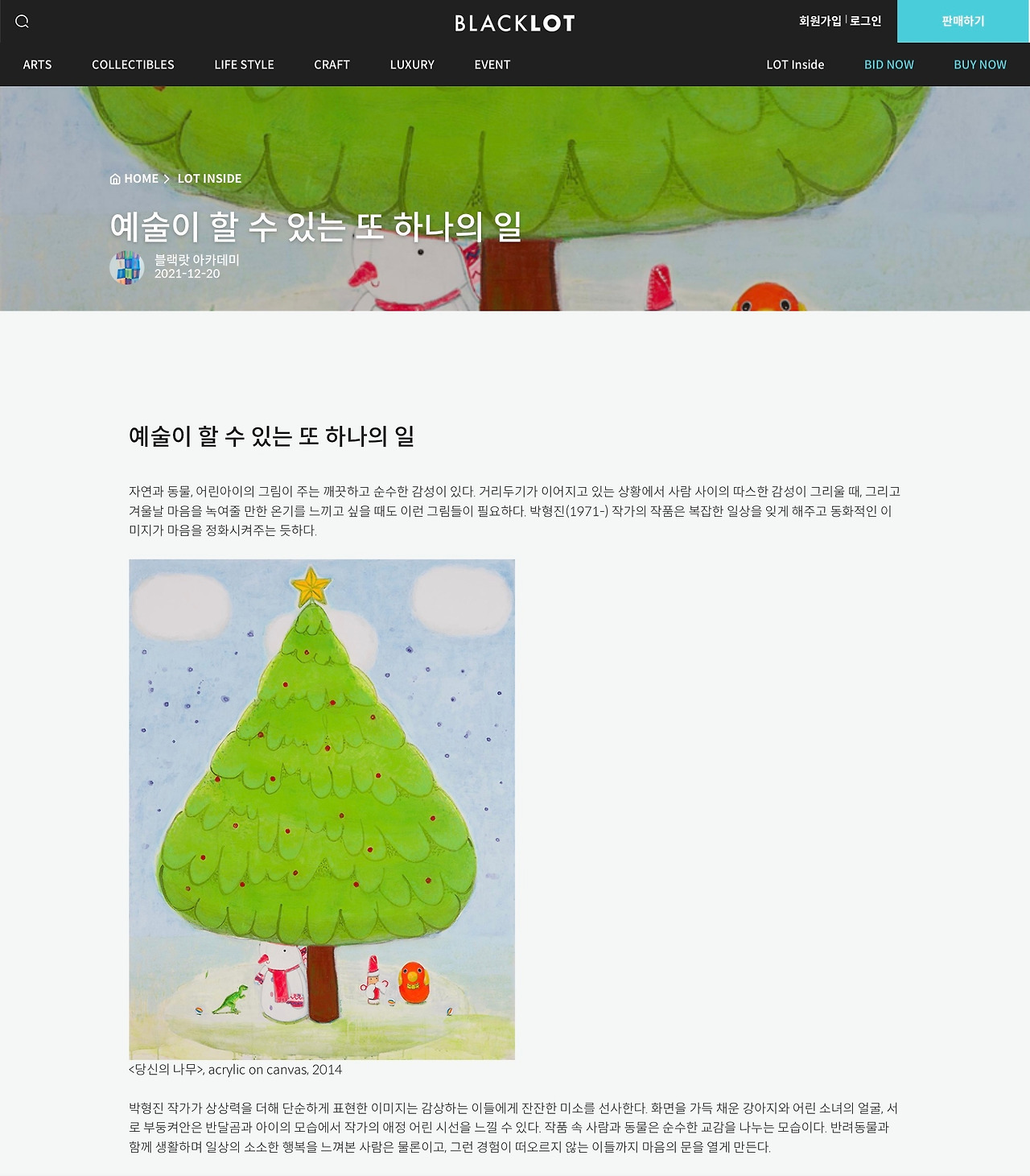 박형진 작가와 동물권행동 카라가 함께하는 블랙랏 자선 경매에서는 총 4점의 작품을 만날 수 있다. 2014년 제작한 ‘당신의 나무’는 크리스마스 트리를 연상시키는 연녹색 나무 아래 눈사람과 여러 동물들의 모습을 함께 그려 넣은 작품이다. 2021년 제작한 ‘너와 함께-행복’, ‘빅허그’, ‘너에게-크리스마스 선물’ 세 작품은 캔버스에 목탄으로 반달가슴곰과 어린 소녀의 모습을 그렸다. 사람과 동물의 교감을 보여주는 작가의 특징이 드러나면서도 사육곰에게 크리스마스 선물을 전하고 싶다는 이번 경매의 취지가 느껴지는 작품이다.