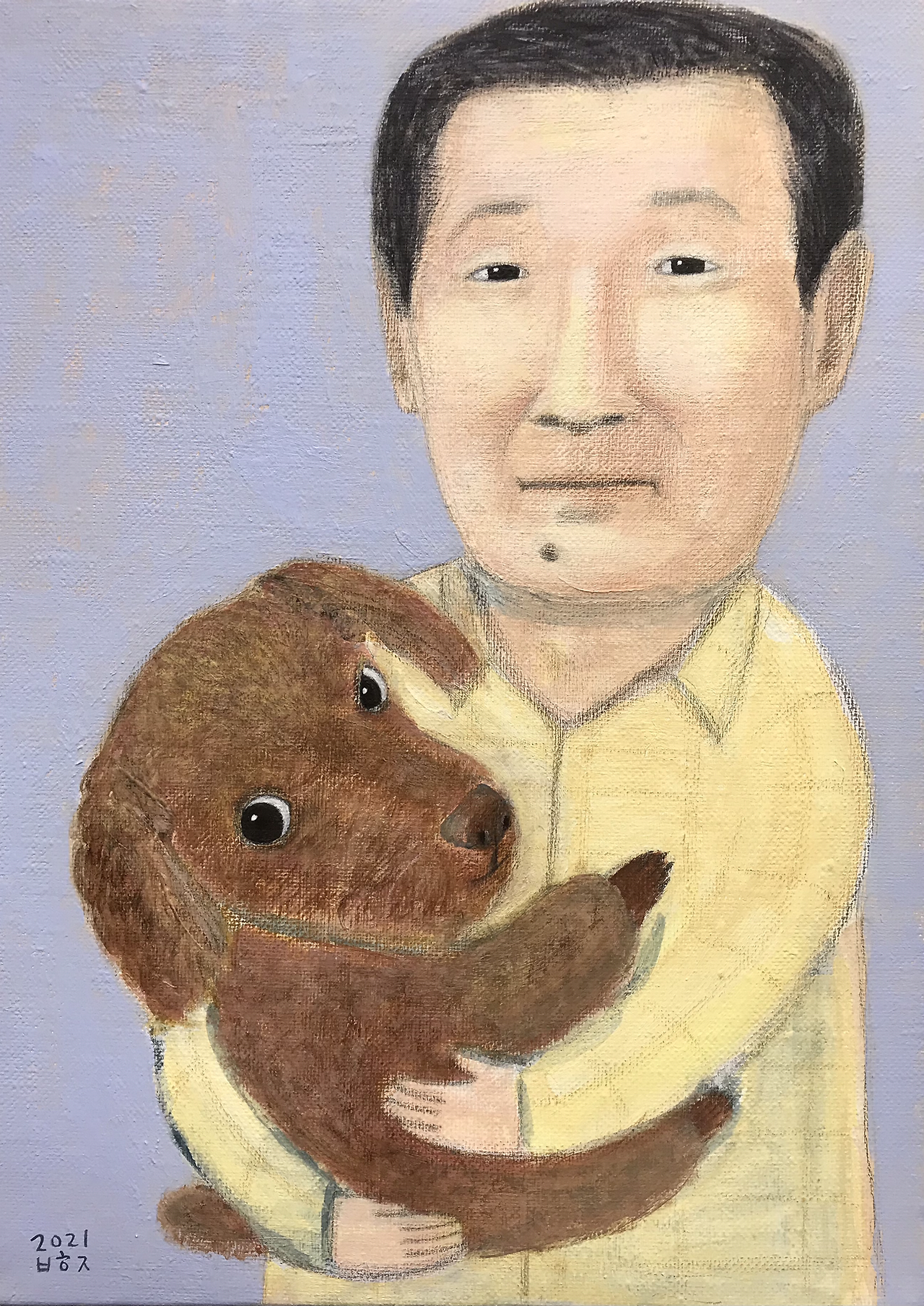 여러 장의 사진과 약간의 이야기들을 토대로 작업 계획을 세우고 내가 느낀 고인의 모습을 표현해 보았다. 고인의 마지막 모습보다 젊을 때의 모습, 노견인 살구도 조금 더 털이 풍성하고 발랄했던 때를 그렸다. 건강하고 젊었을 때의 아버지와 살구가 가족들을 바라보며 미소 짓고 있다.