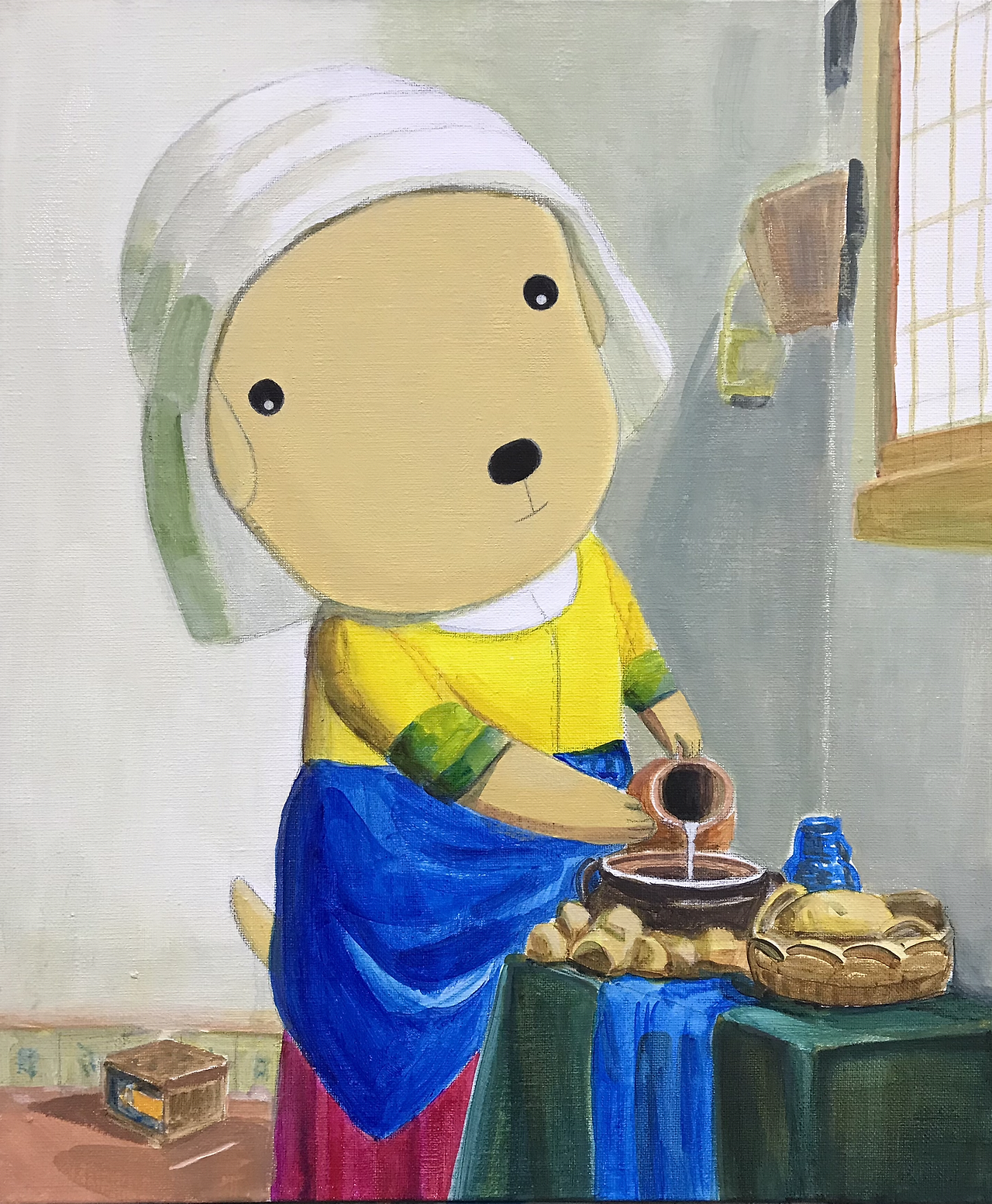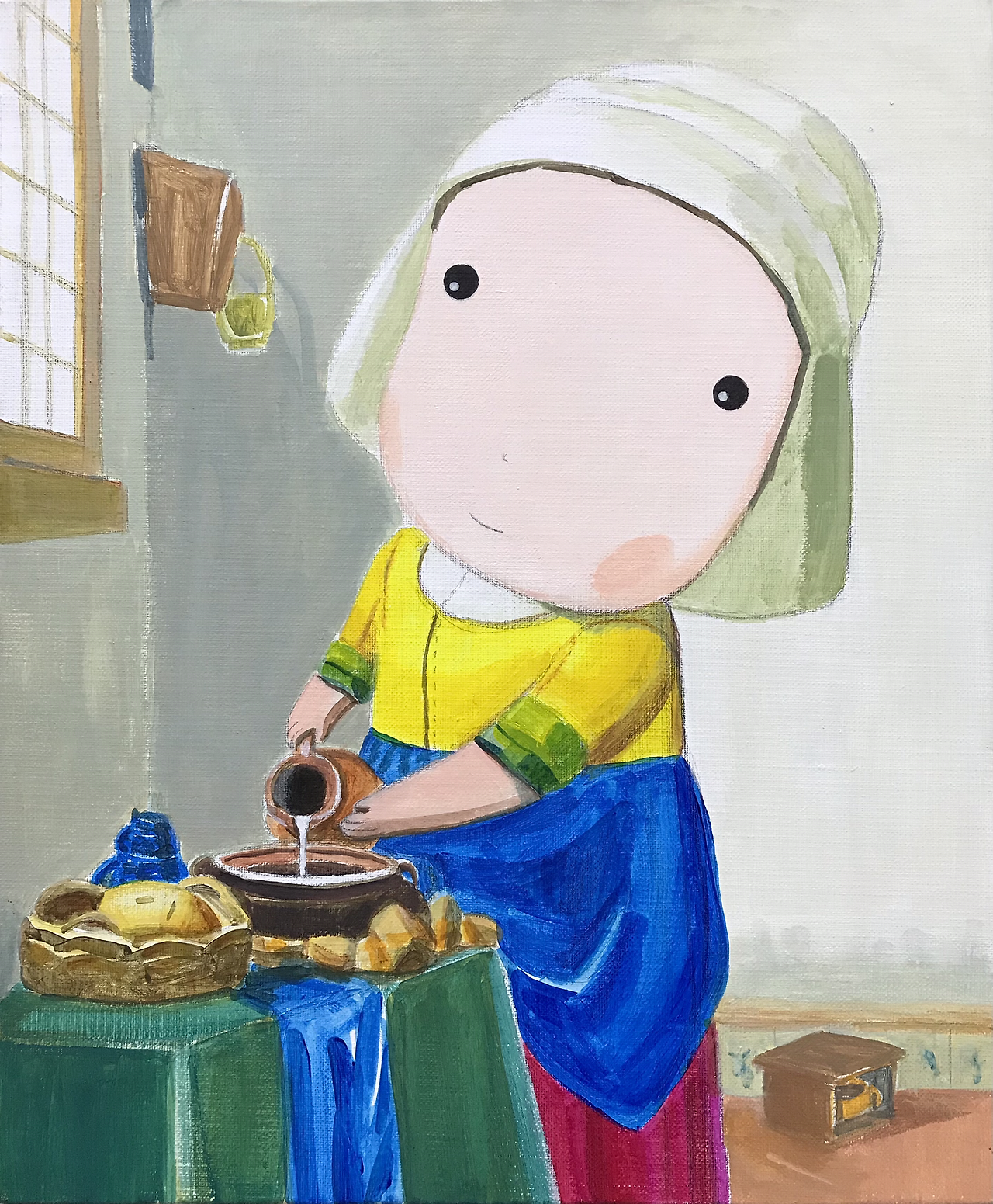 한 달 간의 유럽배낭여행 중 네덜란드의 한 미술관( 라익스뮤지엄 Rijksmuseum 우리나라로 치면 국립현대미술관 )에서 ‘베르메르 Johannes Vermeer’ 의 <우유를 따르는 하녀 The milkmaid>를 실물 영접 후 깊은 감명을 받았다. 한국에 돌아와, 그 감동을 대학 졸업 작품으로 제작하기로 마음 먹고, 한 학기 내내 베르메르의 <The milkmaid> 오마쥬 작품을 제작하였다.
