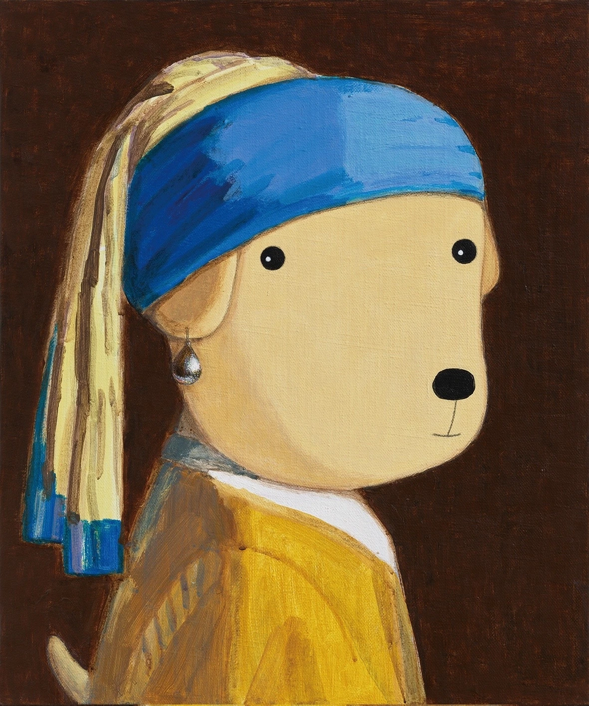 몇 해 전, 나의 그림과 명화를 컬래버레이션하여 작품을 그려줄 수 있겠냐는 모업체의 재미있는 기획을 제안받고 나는 망설임 없이 베르메르를 다시 오마쥬 하기로 마음먹었다. 그렇게 해서 탄생한 작품이 <진주귀걸이 멍멍이>와 <진주귀걸이 아이>다.