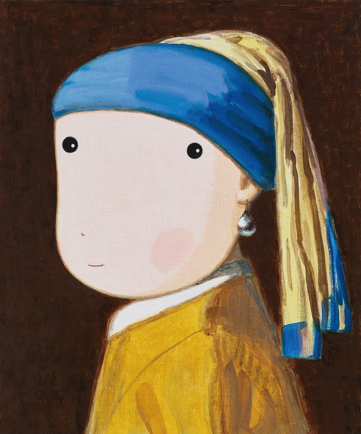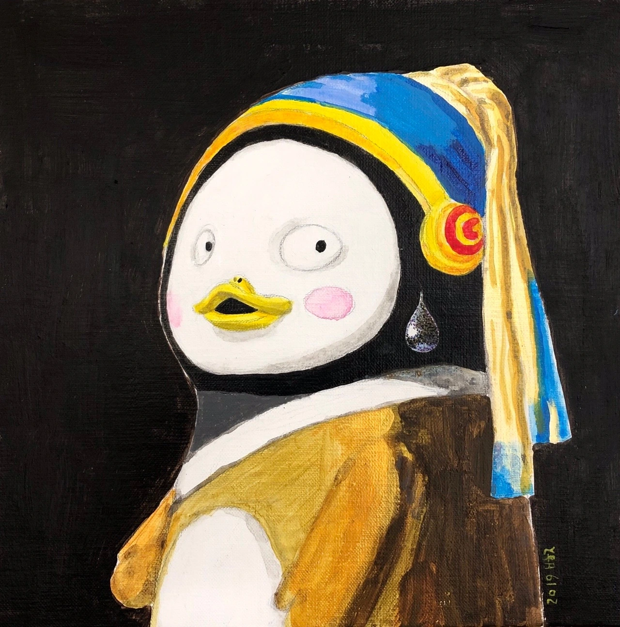 나의 최근 작업에 자주 등장하는 아이와 강아지를 <진주귀걸이 소녀 Girl with a Pearl Earring>와 합성하여 만든 작품인데, 베르메르 작품의 원화와 거의 같은 크기로 제작을 하였다. 그림의 포인트인 진주 귀걸이를 제대로 그리기 위해 수많은 도판 이미지들을 확인하면서 알게 된 것. 진주 귀걸이를 얼핏 보면 ‘원구’ 같지만, 원본 이미지는 ‘물방울 모양’에 가까웠다.