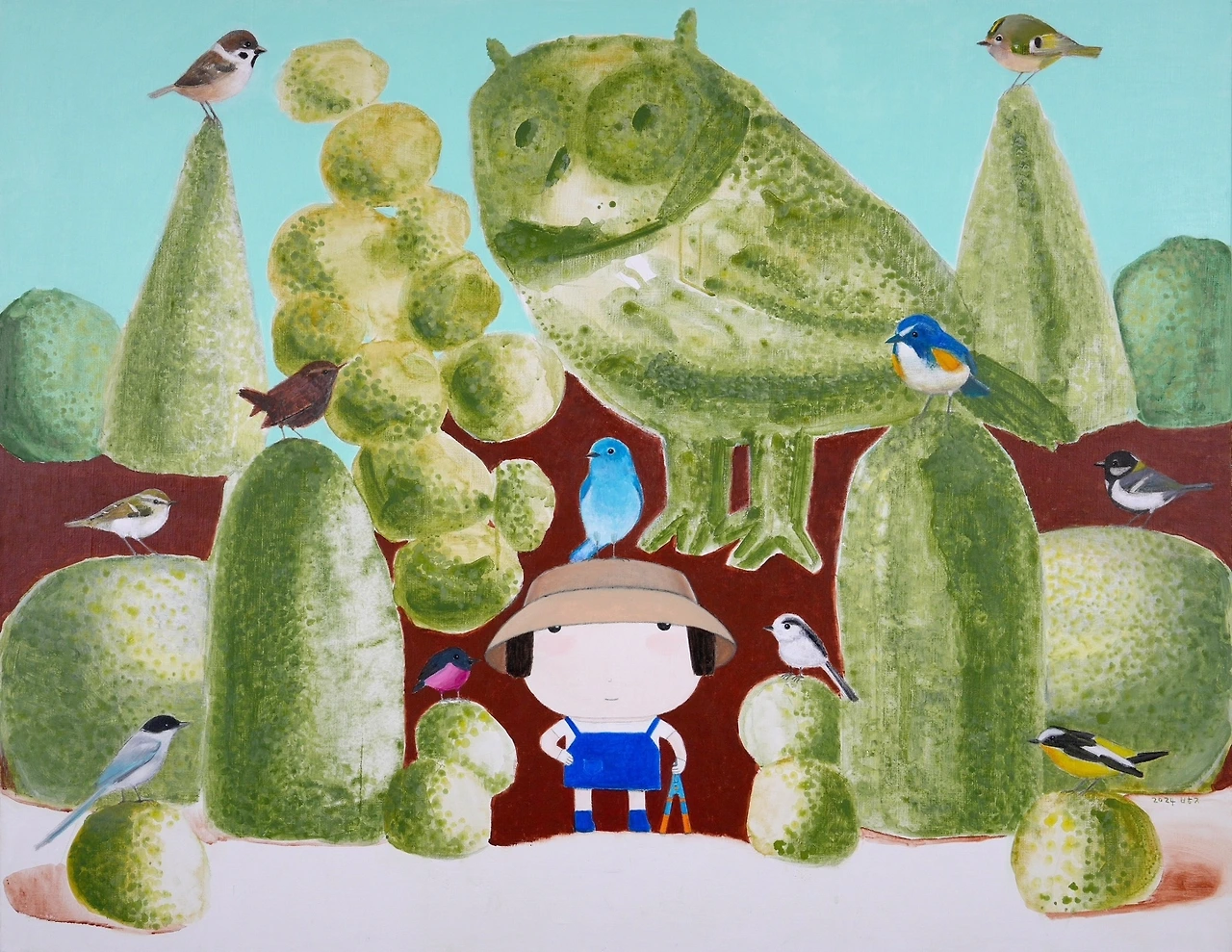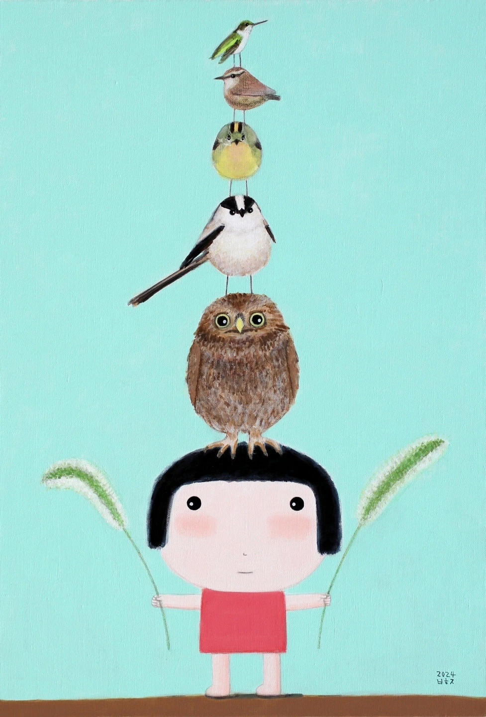 오랫동안 내 작업에 등장하는 작은 인물과 동물, 커다란 식물 등은 시간이 지나면서 조금씩 변화 혹은 진화하는 중이다. 그중 작은 사람의 모습을 한 '아이'는 2021년을 기점으로 '타이니키드 Tinykid'로 재탄생하였다. ‘타이니키드’는 ‘아이’보다 좀 더 적극적이며 나름의 세계관 (TU : Tinykid Universe)을 갖고 있다. 부상당한 '파랑새'를 구조하거나 정원을 가꾸는 일 같은 현실 생활의 직접적인 경험들은 그림 속에 존재하는 '타이니키드'가 활동하는데 중요한 컨텐츠가 되어 작품 속 이미지로 형상화된다. 타이니키드에게 안겨 있거나 머리 위에 머물고 있는 '새'를 그린 '새랑 With the bird' 시리즈가 그렇다.