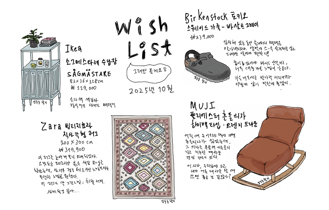 - 사고 싶은 물건 100개 중에 위시리스트에 올라갈 물건들 4-5개 정도만 추려내고, 그 물건들을 그리면서 사고싶은 이유를 생각해본다. 그리고 일주일쯤 보면서 정말 필요한가? 이 돈을 주고도?를 고심해보고, 그래도 사고싶으면 남편과 상의 후에 산다.