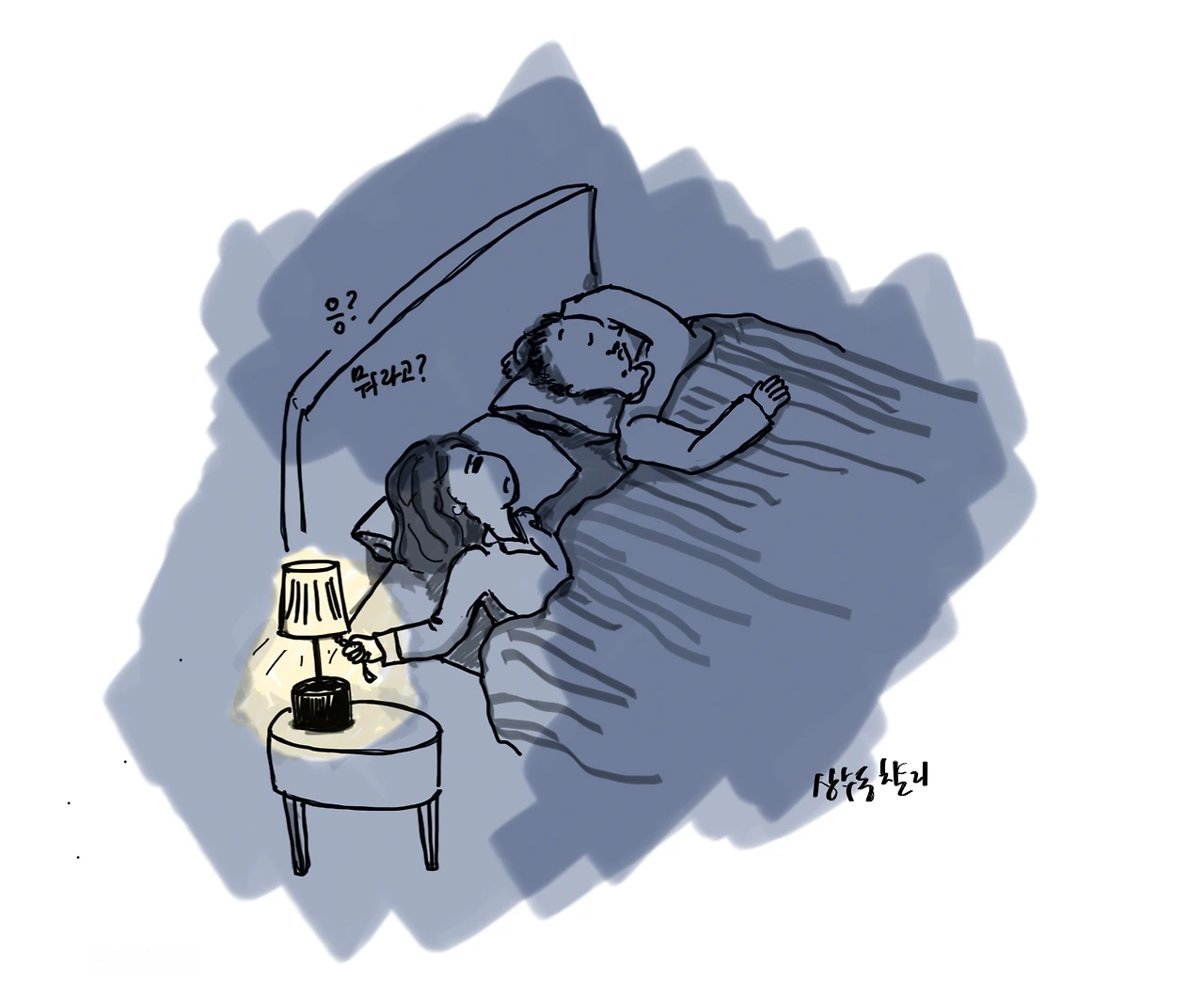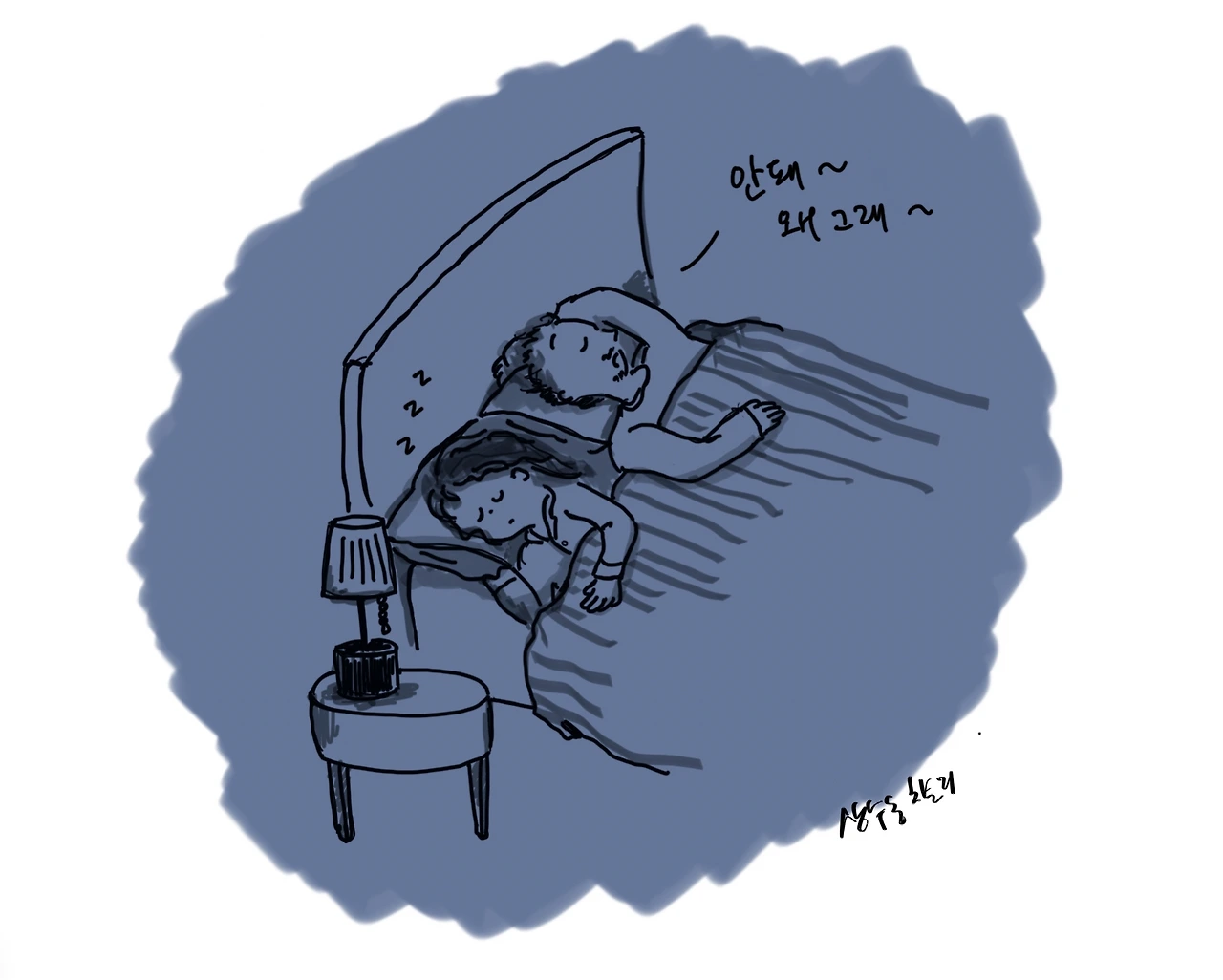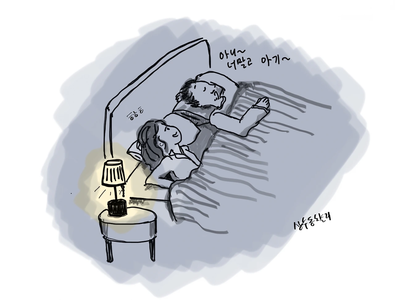 얼마 전 잠을 자고 있었는데 남편이 옆에서 "왜 그래~" 라며 추궁하는 듯한 말투로 말을 걸었다. 잠에서 깨서 비몽사몽한 상태로 "왜? 뭔데?" 하고 물었다. 내가 자다가 뒤척여서 그게 불편했나? 남편은 "아니~ 너 말고 아기~" 라고 대답했다. 눈도 뜨지 않은 채. 남편이 아기 꿈을 꾸고 있었던 것이다.