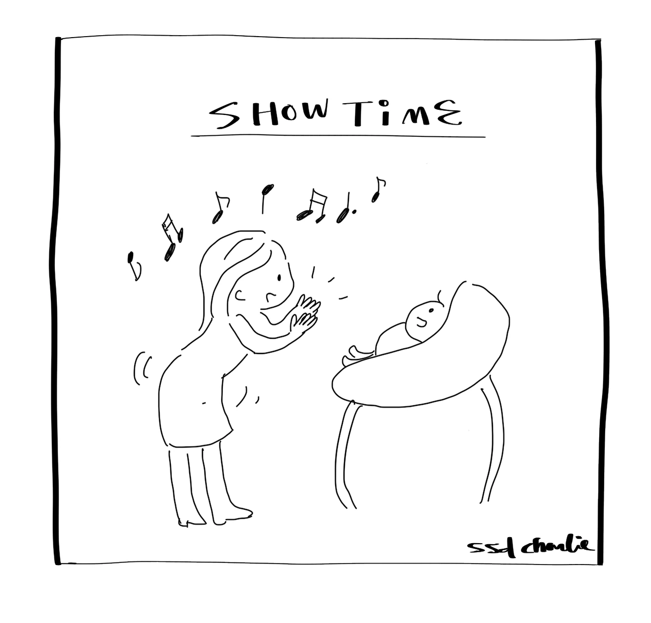 특히 내가 큰 동작으로 노래를 부르고 춤을 추면 그걸 그렇게 좋아한다. ‘우리 모두 다같이 손뼉을! 짝짝!‘ ’링가링가링~가 링가링가링~’ 제목은 모르는 이 두노래가 요즘 나의 레퍼토리로, 포인트는 동작을 크게 하는 것. 팔을 아래 위, 양 옆으로 크게 움직이고 아래위로 뛰고 한바뀌 돌고하다보면 체력이 꽤나 쓰인다. 헉헉. 그러거나 말거나 아기가 웃는다! 도파민 폭발! 계속 할 수 밖에.