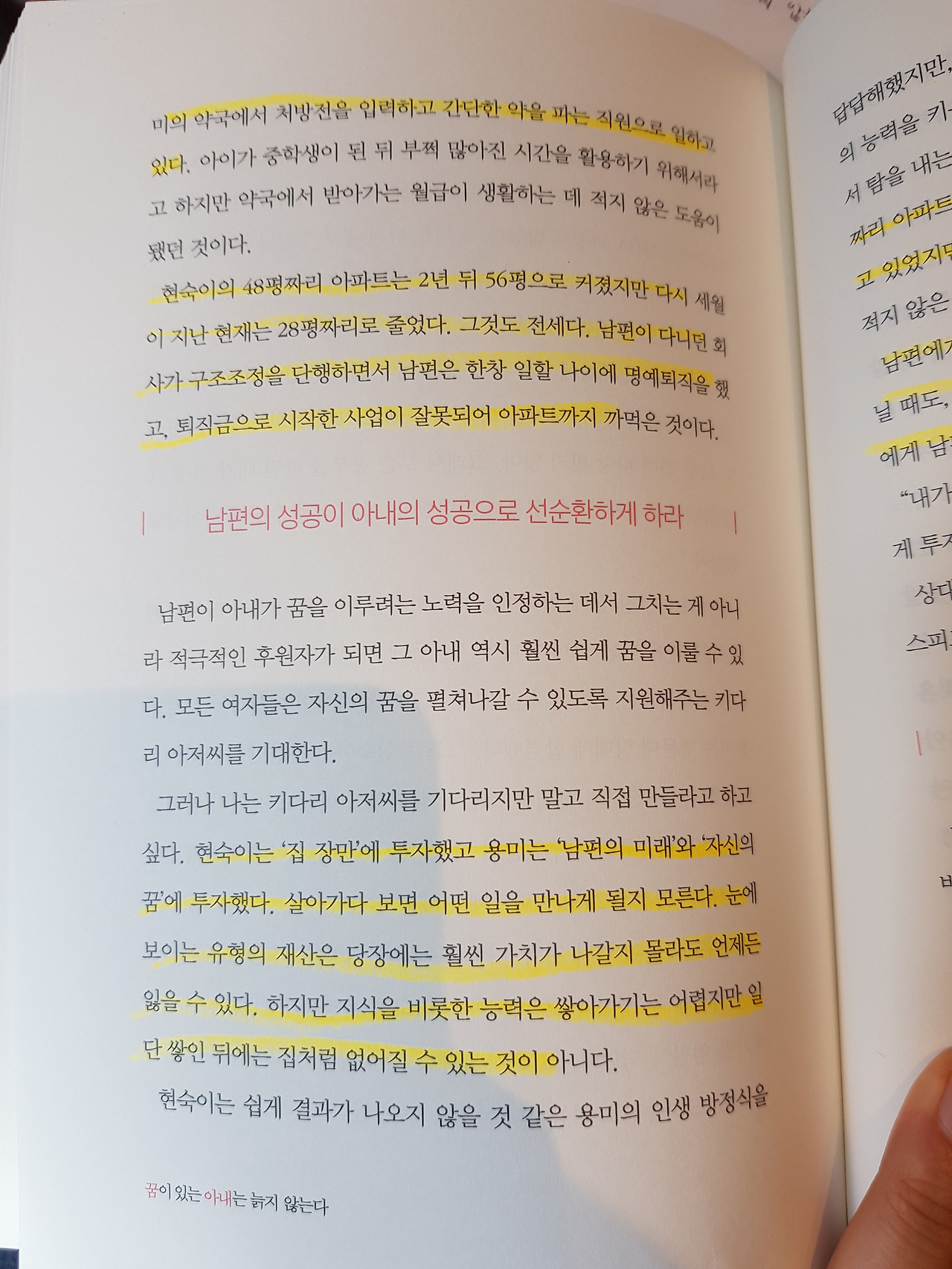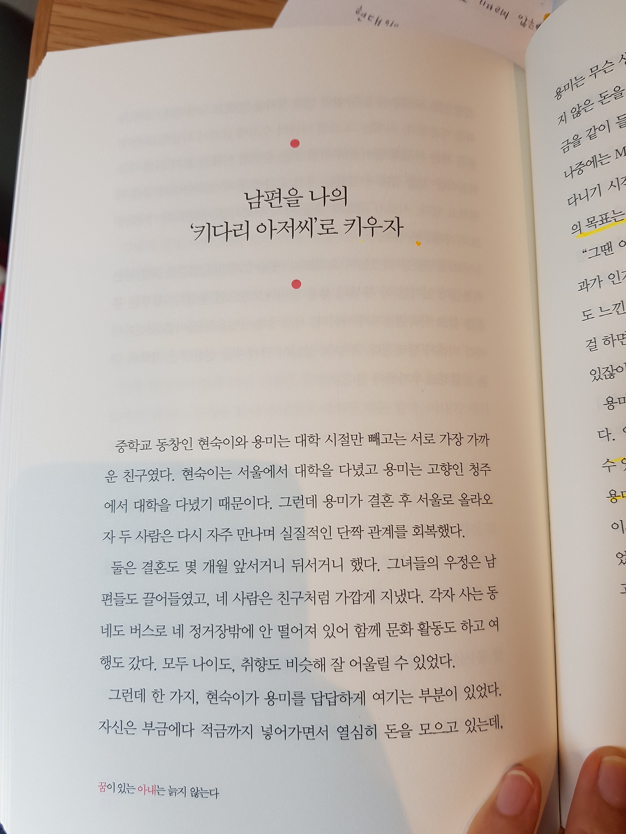 이 책 내용 중에 32살에 약학대학에 입학한 용미 씨 이야기가 나온다. 중학교 동창인 현숙이와 용미가 있었다. 현숙은 재산을 모으는 데 관심이 있다. 반면에 용미는 무슨 생각인지 남편의 학원비와 자신의 학원비로 적지 않은 돈을 쓴다.