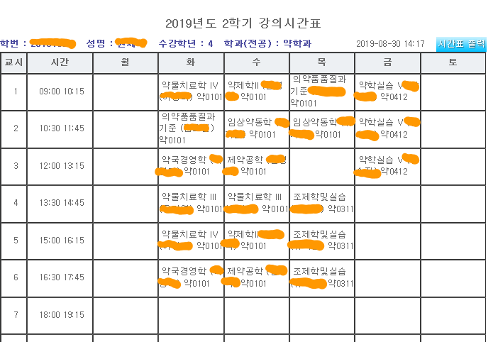 오늘은 대망의 수강신청 날이다. 내가 다니는 과는 약학과라서 사실 거의 모든 과목이 고등학교 시간표처럼 이미 짜여 있다. 그래서 수강신청이 큰 의미가 없다. 그런데 약학 실습은 오전반, 오후반 2가지가 있다. 이번 학기에는 유레카처럼 금요일에 실습이 잡혔다. 그 말인즉슨 금요일 오전반을 수강 신청하게 되면 금요일 오후부터는 자유의 몸이라는 말씀. 게다가 또 한 번의 유레카가 있으니. 월요일이 완전 공강이다. 금요일 오후부터 월요일까지 자유의 시간~~~ 정말 짜릿하지 않은가. 애기 엄마도 애기 엄마가 아닌 싱글 친구들도 도저히 그냥 지나칠 수 없는 시간표다.
