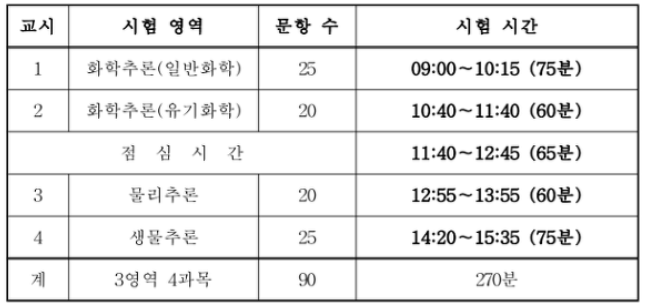 1교시는 일반화학시간이었다. 일반화학은 언제나 시간이 부족한 과목이다. 아는 문제는 풀고 모르는 문제는 제껴야 한다. 시간 내에 모든 문제를 보겠다는 전략으로 접근해야 하는 과목이다. 안 풀리는 문제에 시간을 보내다가는 내가 풀 수 있었던 문제들을 놓쳐버리기 십상이기 때문이다. 느낌은 나쁘지 않았다. 모르는 문제도 있었지만 아는 문제를 실수하지 않고 풀려고 노력했다.