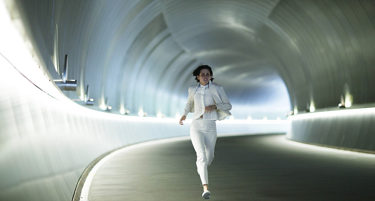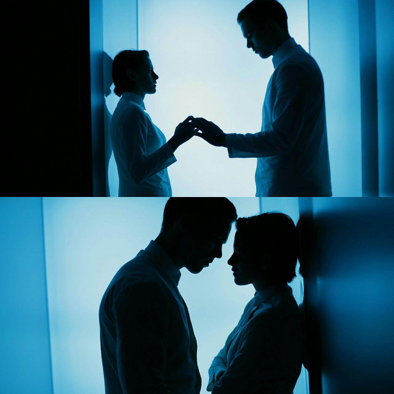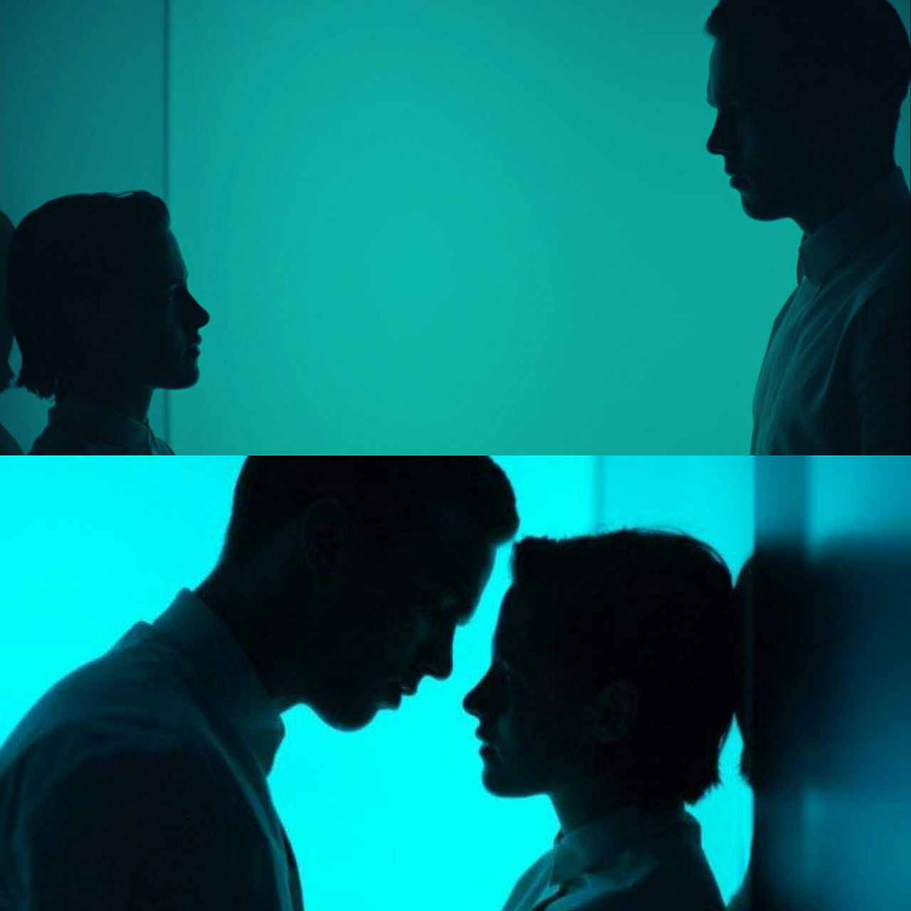 순백의 사일러스에게 사랑이라는 감정으로 색감을 더해준 이는 따로 있었다. 니아는 직장 동료이자 사일러스보다 더 일찍 S.O.S. 증상을 지니고 있었으나 사일러스와는 다르게 이를 모든 이들로부터 숨긴 채 살아왔다. (이를 영화 속에서 '하이더(Hider)'라고 일컫는다.) 그런 그녀를 알아본 건 사일러스다. 사랑이 무엇일까 궁금해하면서 동시에 금지된 행동을 한다는 사실에 그들은 두려워한다. 그런 그들의 마음을 감독은 우리가 흔히 생각할 수 있는 방식으로 접근하지 않는다. 밀실에 남자와 여자의 실루엣을 서늘한 색깔들과 함께 연출하는데 이는 사랑을 하면 할수록 더 서늘해진다. 어쩌면 감정과 다르게 이성은 차가워지기 때문일지도 모른다. 솔직히 이 장면을 가장 좋아한 이유는 배경 색과 또렷하게 대비되는 그들의 그림자를 통해서 그들이 느끼는 미세한 떨림까지 고스란히 전해주기 때문이다.