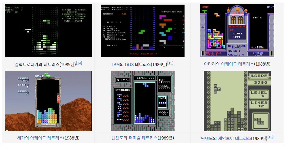 초창기 각 플랫폼/배급사에서 출시된 테트리스의 모습 (위키피디아에서 발췌)
