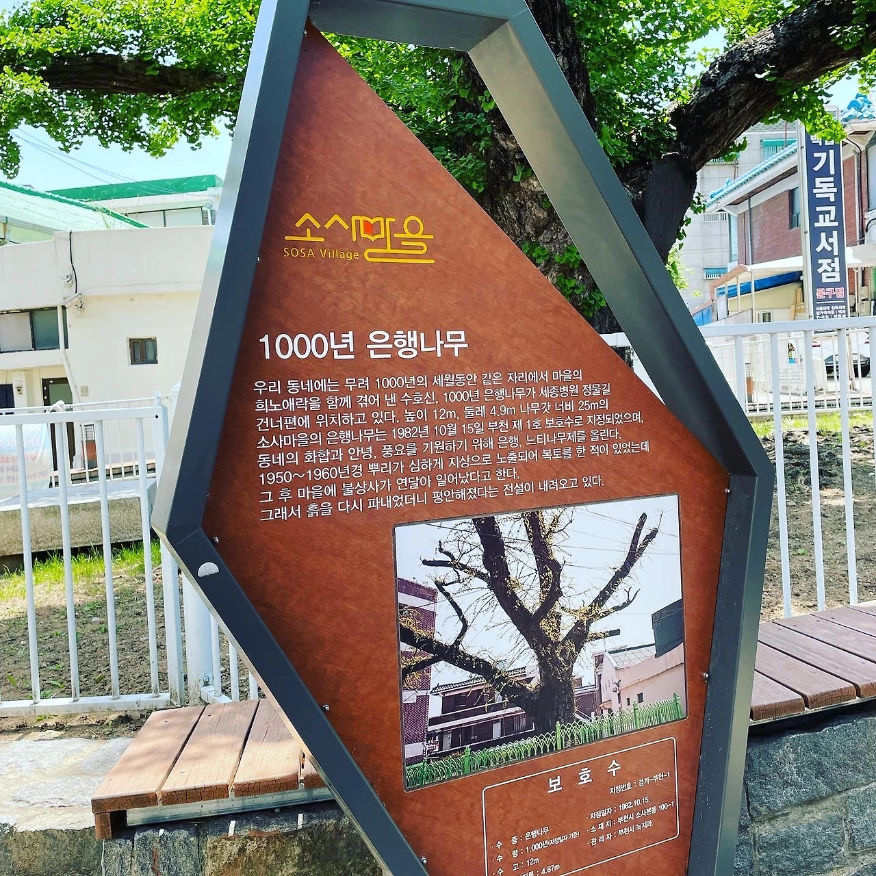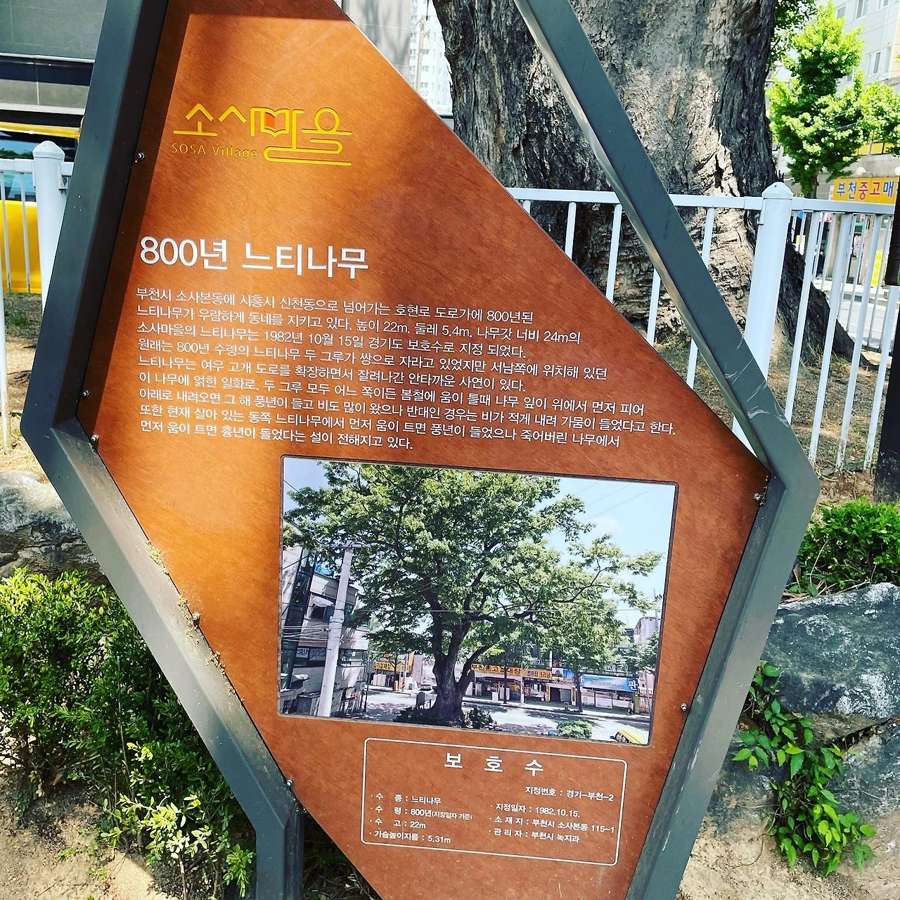 신기한 마음에 나무에 있는 표지판을 오늘 처음으로 자세히 읽어보니 원래는 짝꿍 나무가 한그루 더 있었는데 도로를 뚫으면서 쌍둥이 나무는 지금은 소실되고 현재 한그루만이 그 자리를 지키고 있다고 했다.