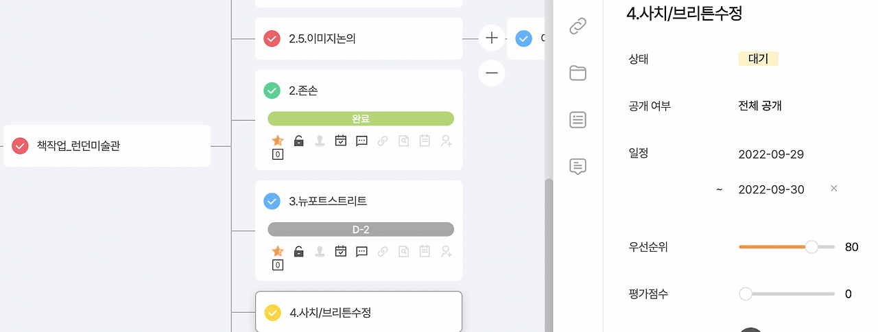 체크(✔️)의 색을 통해 프로젝트 현황도 '대기/완료/진행/보류' 등으로 구분할 수 있다.