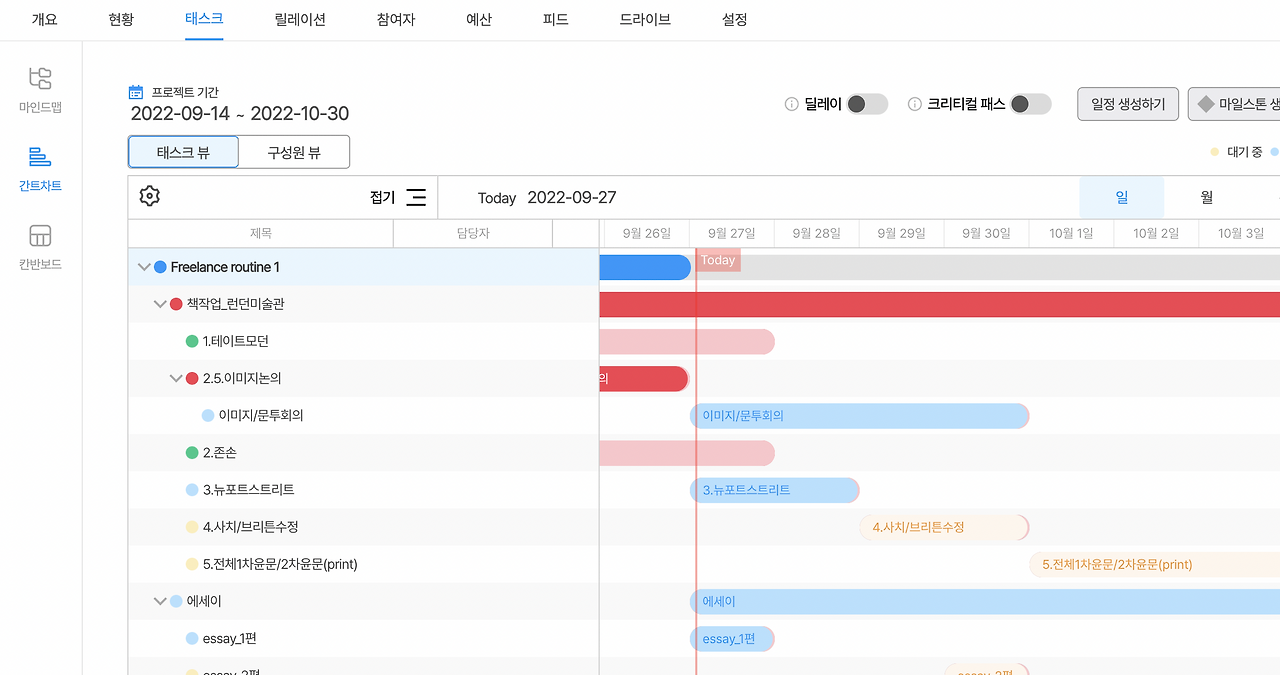 태스크의 간트차트는 '오늘' 해야 할 일들을 일목요연하게 확인할 수 있는 탭이다.