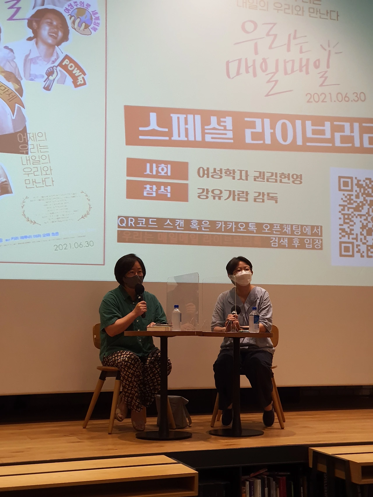 영화가 끝난 뒤엔 바로 옆 라이브러리로 자리를 옮겨 권김현영 선생과 강유 감독의 GV를 들었다. 권김 선생도 영 페미이며 영화 속에 안희정 재판 2심 기자회견의 연사로 모습을 비춘다. 한 시간 가량 진행된 GV는 카카오톡 오픈채팅방으로 질문을 받았는데 현재진행형 페미로 살고자 하는 이들의 밀도 높은 질문이 이어졌다.