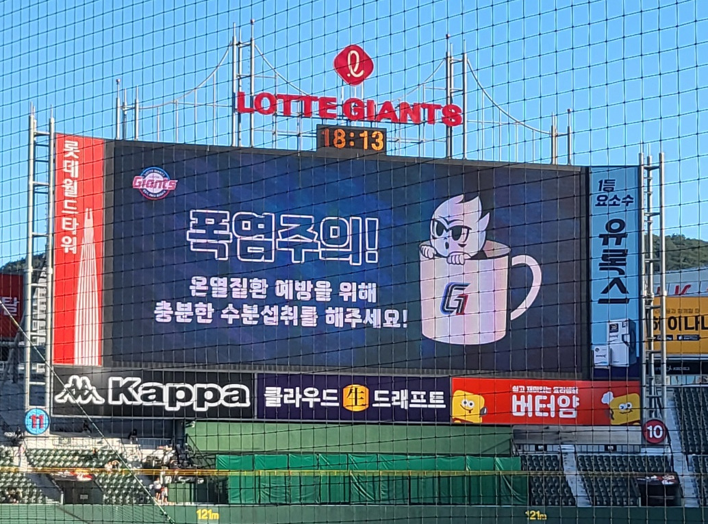 종이 티켓을 뽑고, 야구장 안으로 들어갔다. 33도를 웃도는 폭염이라 '헉' 소리가 절로 나오는 날이었는데, 입구 곳곳에 화장품 미스트 마냥 고운 분사를 자랑하는 쿨링포그가 설치돼 있었다. 더위 해갈에는 역부족이었지만, 없는 것보다는 나았다. 재방문이라 익숙하게, 311구역에 헤매지 않고 앉았다. 3루쪽 원정팀 더그아웃 바로 뒷자리였다. 전광판에 떡하니 '폭염주의'가 떠올라 있었다. 얼굴에서도 가장 연약한 부위인 눈알이, 실시간으로 익어가는 것 같은 날씨였다. 모자도 눌러쓰고, 양산도 쓰고, 휴대용 선풍기에, NC의 굿즈인 이용찬이 그려진 '쫌' 부채까지 동원해 안간힘을 써봤다. 바로 옆 블록에는 커다란 리얼 선풍기를 들고 온 분이 있어, 아직 진정한 '야구 찐팬'이 되려면 멀었다고, 그 분을 보며 생각했다.