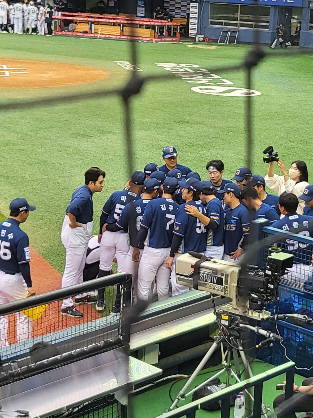 아니나 다를까, 이날 3루 원정석에서는 다수의 'NC 양의지'(NC 유니폼에 '양의지'를 마킹한 사람)와 '두산 박건우'(두산 유니폼에 '박건우'를 마킹한 사람)를 만날 수 있었다. 특히 'NC 양의지'는 마산 NC파크에서도 자주 본 레퍼토리였는데, 그는 2019년 NC로 이적한 이래 줄곧 팀내 유니폼 판매 순위 1, 2위를 다퉜었기 때문이다. '두산 박건우'는 그가 두산 소속이었던 2009~2021년이라는 무려 12년에 달하는 기간 중 어느 순간에 그를 아끼고 사랑했던 팬덤의 증거일 것이다. 그걸 착잡한 마음으로 바라보고 있자니, 저 멀리 두산 더그아웃에서 '90즈'(두산 소속으로 절친했던 90년생 3인방 허경민-정수근-박건우를 이른다)가 재회해 노닥거리고 있었다. 착잡을 넘어 울적해졌다. Y에게 말했다.