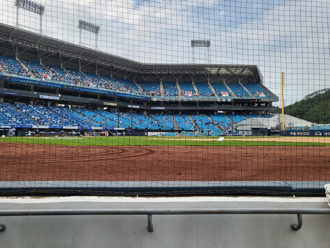 지류 티켓을 끊어서 외야로 입장했다. 나의 자리는 1루 익사이팅존. 라팍은 광주 챔필과 더불어 원정 더그아웃이 1루에, 홈 더그아웃이 3루에 있는 구조다. 라팍의 익존은 잠실의 익존 마냥 누에서 한참 뒤에 있지 않고 주루코치 바로 뒤에 근접하다는 얘기를 듣고, 내야석 대신 익존을 예매했다. 가서 앉아보니, 잠실보다는 훨씬 내야에 바투 붙어 있어서 마운드에 오른 투수 피칭이나 타석도 제법 잘 보였다. (주루코치만 나의 시야에 있지 않는다면) 나는 익존에서도 두 번째 열, 더그아웃 바로 옆 자리였다. 익존 특유의 반지하뷰 때문에 그 앞을 지나다니는 선수들이 무대에 오른 배우 같아 보였다.