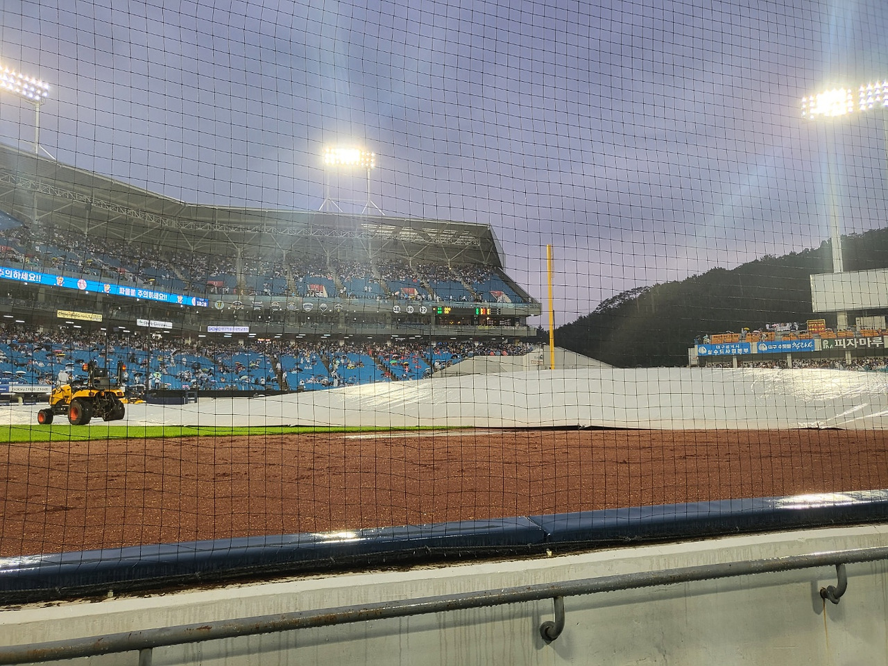 그렇게 한 시간쯤 흘렀을까, 빗방울이 잦아들었다. 전광판에 '그라운드 정비 후 19시 20분에 시작될 예정'이라는 안내 문구가 떴다. 키퍼들이 다시금 뛰쳐나와 방수포 위에 고인 빗물들을 퍼내기 시작했다. 더그아웃에서 선수들이 나와, 비 그친 운동장의 강아지들처럼(왠지 그래 보였다) 좌우로 뛰어다니기 시작했다. 경기장 처마 밑에 있던 관중들이 주섬주섬 자리로 복귀했다. 아예 이탈한 관중들은 많지 않아 보였다. 야구 한 경기를 위해, 각 팀의 선수들과 코칭 스태프들 뿐 아니라 얼마나 많은 이의 노고가 소요되는지를 목도하는 자리였다. 나의 노고도 포함하여.