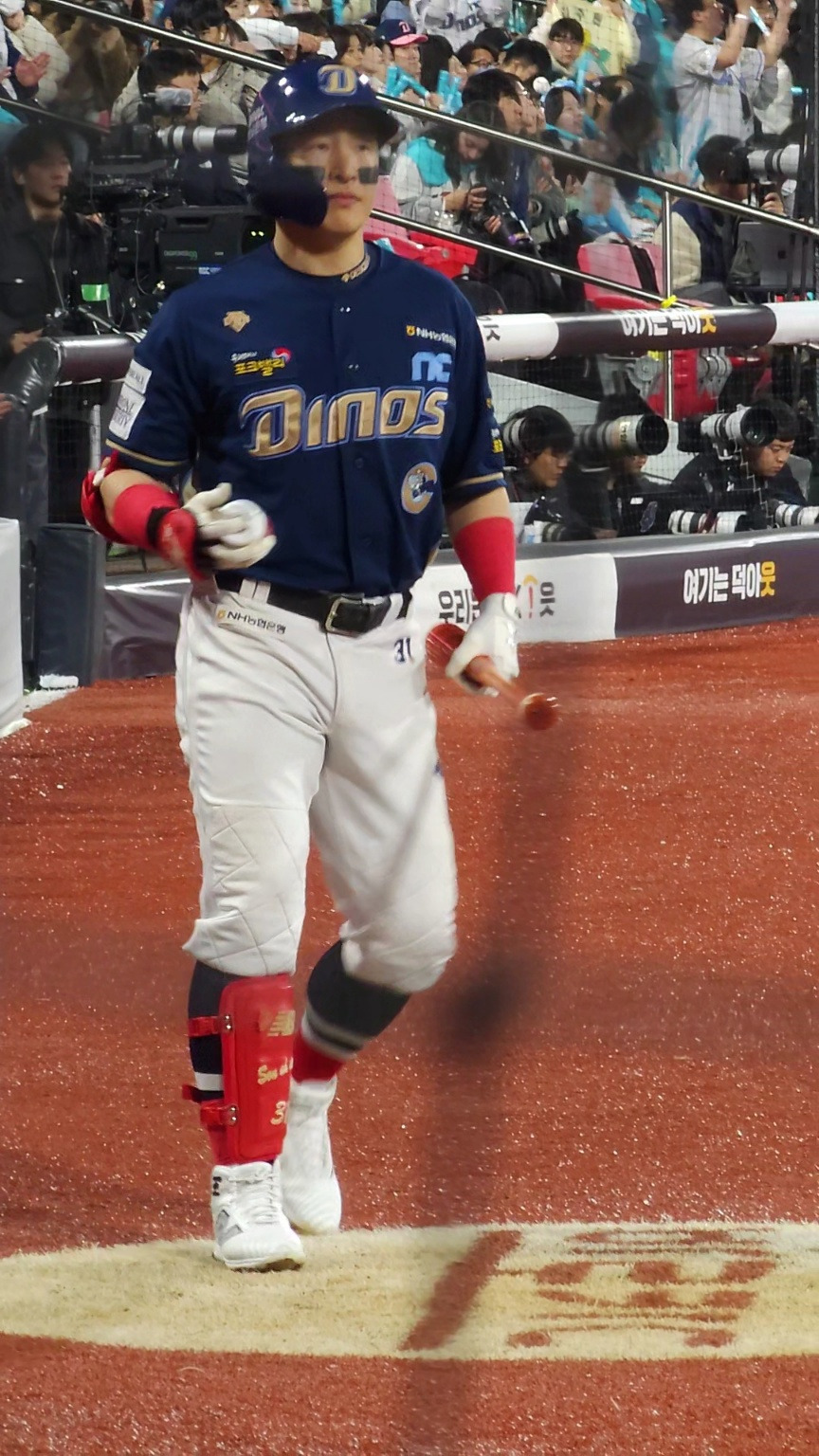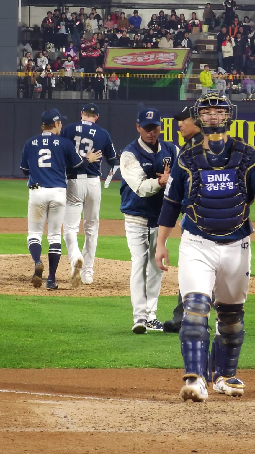반면 우리의 공격 이닝은 길디 길었다. '20승 투수' 페디와 '무패 투수' KT 쿠에바스의 대결이라 투수전 양상이지 않을까 했는데, NC의 타자들은 쿠에바스의 공을 기다렸다는 듯이 쳤다. SSG와의 준플레이오프에서도 NC 타자들이 상대편 투수의 전력분석을 완벽히 한 느낌이었는데, 이번에도 그랬다. 나와 Y 사이의 토템은'1회에 오빠(손아섭)가 출루하면 그 날은 되는 날이다'인데, 아니나 다를까 이날 캡틴은 1회부터 우중간 안타로 선두 타자 출루에 성공했고, 이어 박민우 2루타, 마틴 좌익수 뜬공으로 이어져 선취점을 냈다. 2회에는 '마산 대장' 오영수가 솔로포를 터뜨렸다. 더그아웃이 흥분으로 넘실 거렸다. 나와 Y도 있는대로 소리를 질러가며 기쁨을 만끽했다.