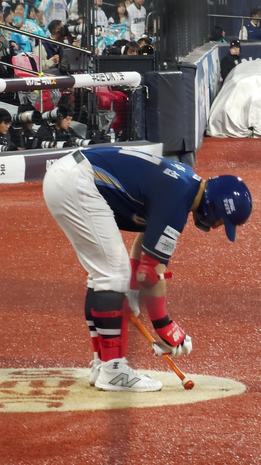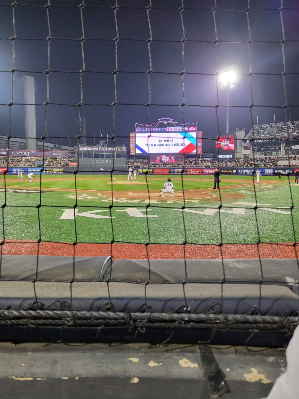 그 넓은 야구장에서 확보 가능한 시야란 앉은 자리에 따라 대단히 제한적이다. 이 날은 자리가 자리인지라 타자들의 대기 타석 루틴이나, 더그아웃 상황 같은 것들이 유독 눈에 들어왔다. 대기 타석에서는 홈인 해서 들어오는 주자가 있으면 하이파이브도 하고(아웃 돼서 들어오는 주자 혹은 타자에게는 엉덩이도 토닥이고) 방망이에 미끄럼 방지 스프레이도 뿌리고 각자의 루틴에 따라 허공에 방망이를 헬기 띄우듯 돌려봤다가 앞선 타자 타이밍에 맞춰 스윙도 몇 번 날려보는 등 대기 타석은 대기 타석대로 분주했다. 포수 바로 뒤편, 후면석 1열이었기에 약간은 타석에 선 타자의 입장이 되어 날아오는 볼을 바라보기도 했다. 시속 150km/h를 쉽게 넘나드는 페디의 공은 스쳐도 사망일 듯한 느낌이라 앞에 서있기만 해도 다리가 후들거릴 거 같은데 그걸 어떻게 쳐내는지(물론 쳐내는 타자가 많지는 않지만) 조마조마한 마음이 됐다. 데드볼로 인해 심각한 부상을 입은 후 극심한 타격 슬럼프를 겪었다는 얘기나, 중·고교 때는 투타 겸업을 하다 공이 무서워 투수로 전향했다는 이야기 등에 심히 공감이 갔다.