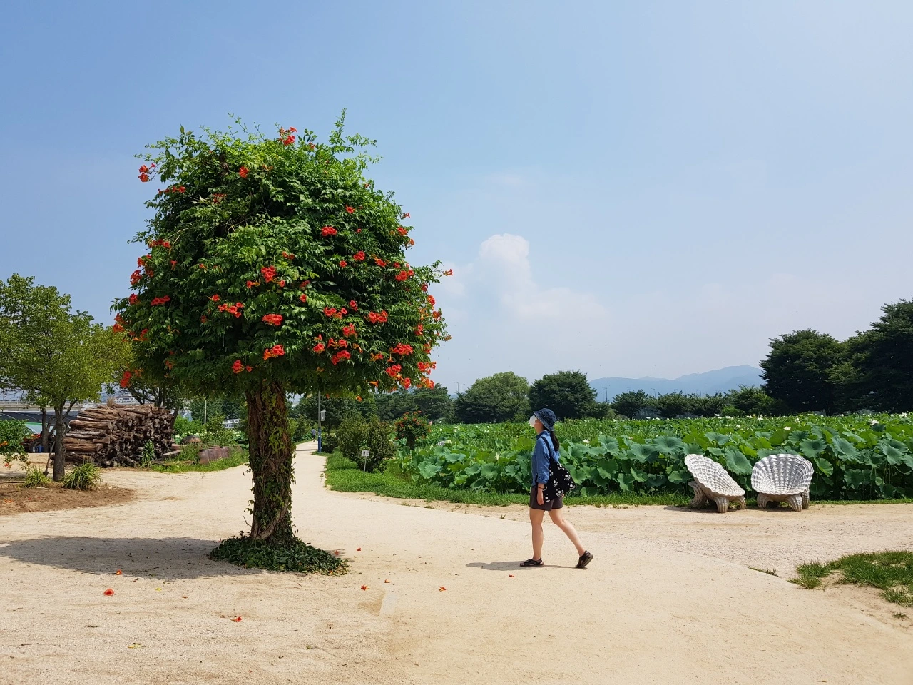 섭씨 36도에 육박하는 폭염에 강행한, 그저께의 짧은 여행은 그렇게 부지런히 여름과 만나는 재미가 있었다. 흙길을 밟아 만난 두물머리의 장쾌함, 싱그러운 연잎과 연꽃 잎사귀, 나무를 집어 삼킨 능소화를 보는 유채색 기쁨. 몸에 나는 땀이 그것들의 현재성을 알알이 알려줬다.