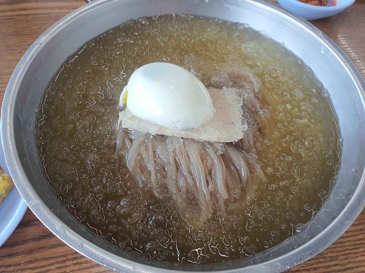 겨울에 먹는 냉면이 더 맛있어야 미식가라지만 그렇게 고급스런 미각을 갖추지 못한 혀에는 여름 냉면도 최고였다. 이날 맛본 양평의 옥천냉면은 면발에 메밀과 고구마 전분이 함께 섞여서 쫄면 같이 탄력이 있었다.(굵기도 굵다) 이게 여름이지 싶게 저항하는 면발들을 힘있게 어금니로 내려 눌러야 하는 맛이었다. 육수도 육중한 무게감이 있는데 달달함은 덜해서 벌컥벌컥 잘 넘어갔다. 속이 꽉 찬 완자도 좋고... (수육은 비계가 덜해서 다소 퍽퍽했지만)
