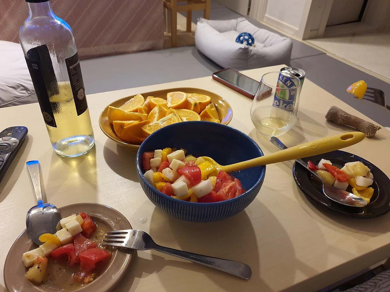 그리고 저녁에 과일과 치즈만으로 구성된 여름 주안상을 받고 나는 뻗어버렸다. (집에 와선 정말로 뻗어 버렸다.) 술맛이 과도해 벌컥벌컥한 탓이다. 차갑게 칠링한 화이트 와인은 산뜻했고 레몬즙이 들어간 샐러드와 시너지를 냈다. 자정에 택시 타고 집에 돌아와보니 손에는 단호박, 복숭아가 그려진 책, 무알콜 하이네켄이 가득 들려 있어서 정말 '여름이었다' 했다...