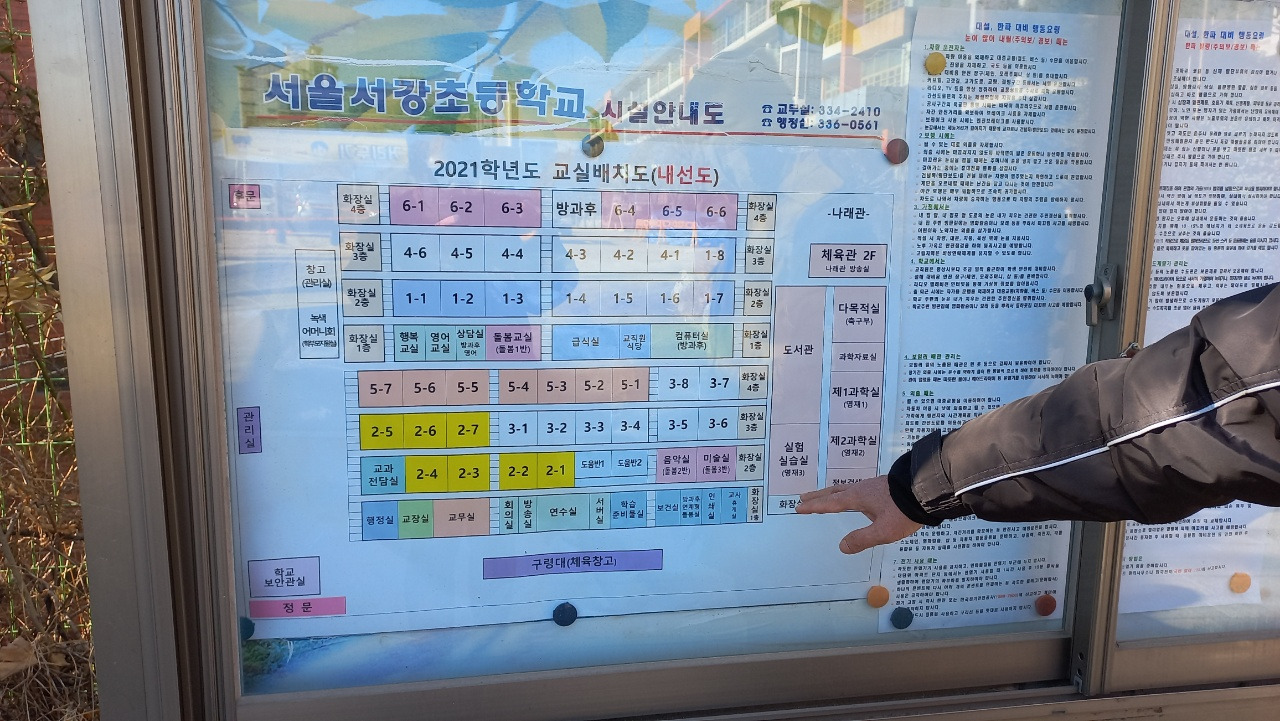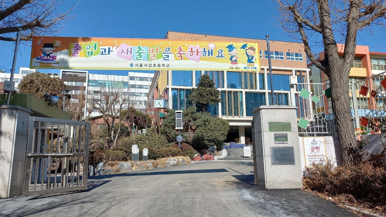 영화관을 나서서 뜨거운 음식으로 추위를 좀 달래고 학교를 향했다. 버스를 타고 서강초등학교를 찾아가는 길은 내 어린 시절 기억과 너무 달랐다. 주변이 아파트 숲이어서 당황스러웠다. 서강초등학교는 1937년 세워진 학교로 85년의 역사를 갖고 있고, 학생 수는 천 명이 조금 안 되는 숫자였다. 교문을 들어서니 학교를 지키는 선생님이 나오셔서 졸업생인데 학교 구경을 할 수 있느냐고 여쭸더니 코로나 때문에 학부모도 출입하지 못하는 형편이라고 난색을 표하셨다. 그러면 여기서 사진만 찍고 가겠다고 양해를 구하고 오래 머물지 못하고 나왔다.
