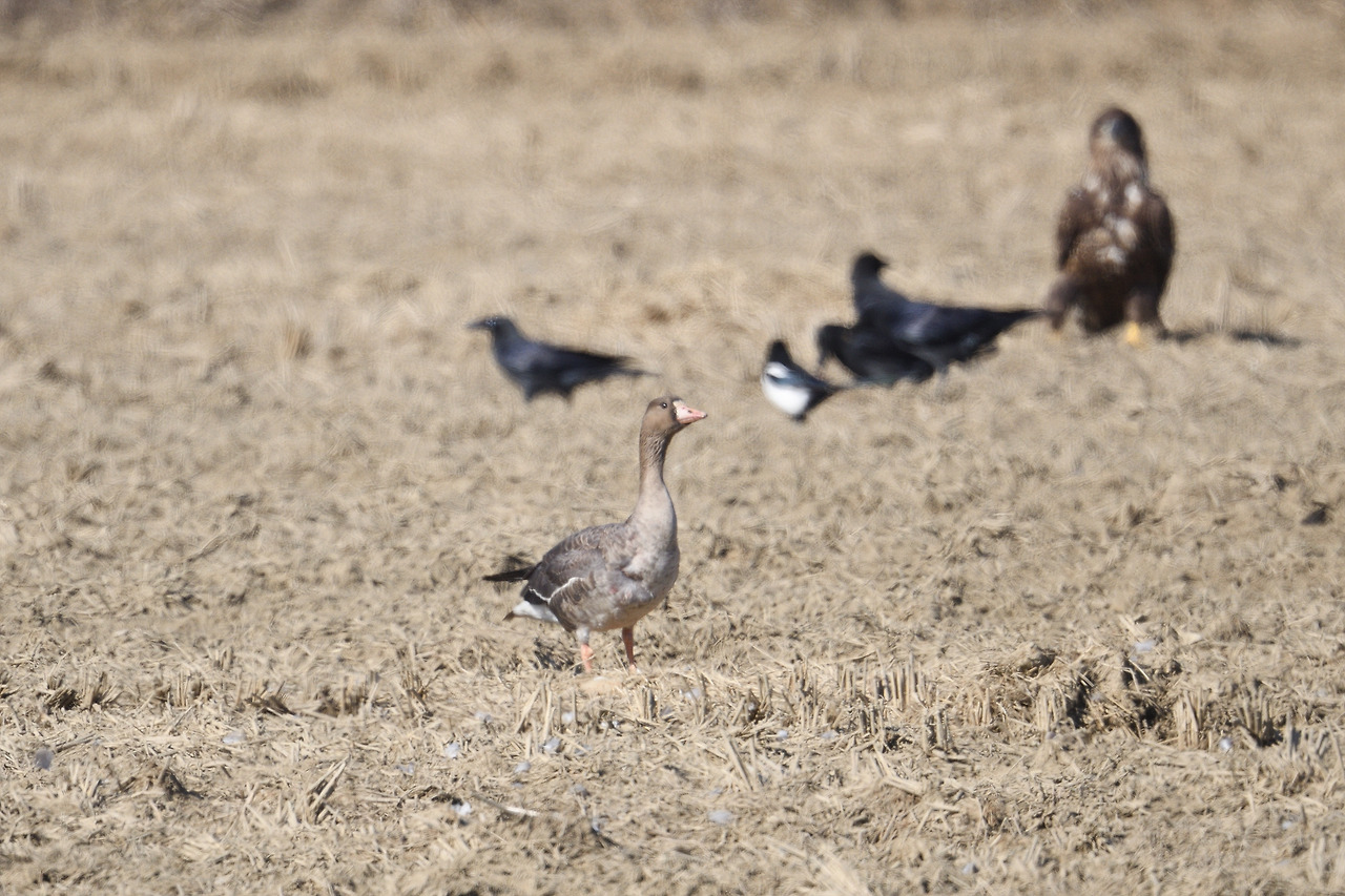 흰꼬리수리가 하늘에 뜨니 재빨리 도망가는 흰기러기
