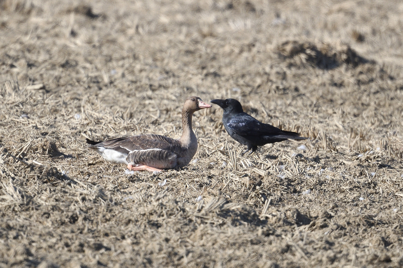 조용히 타이르는 까마귀 옆에 주저앉는 쇠기러기