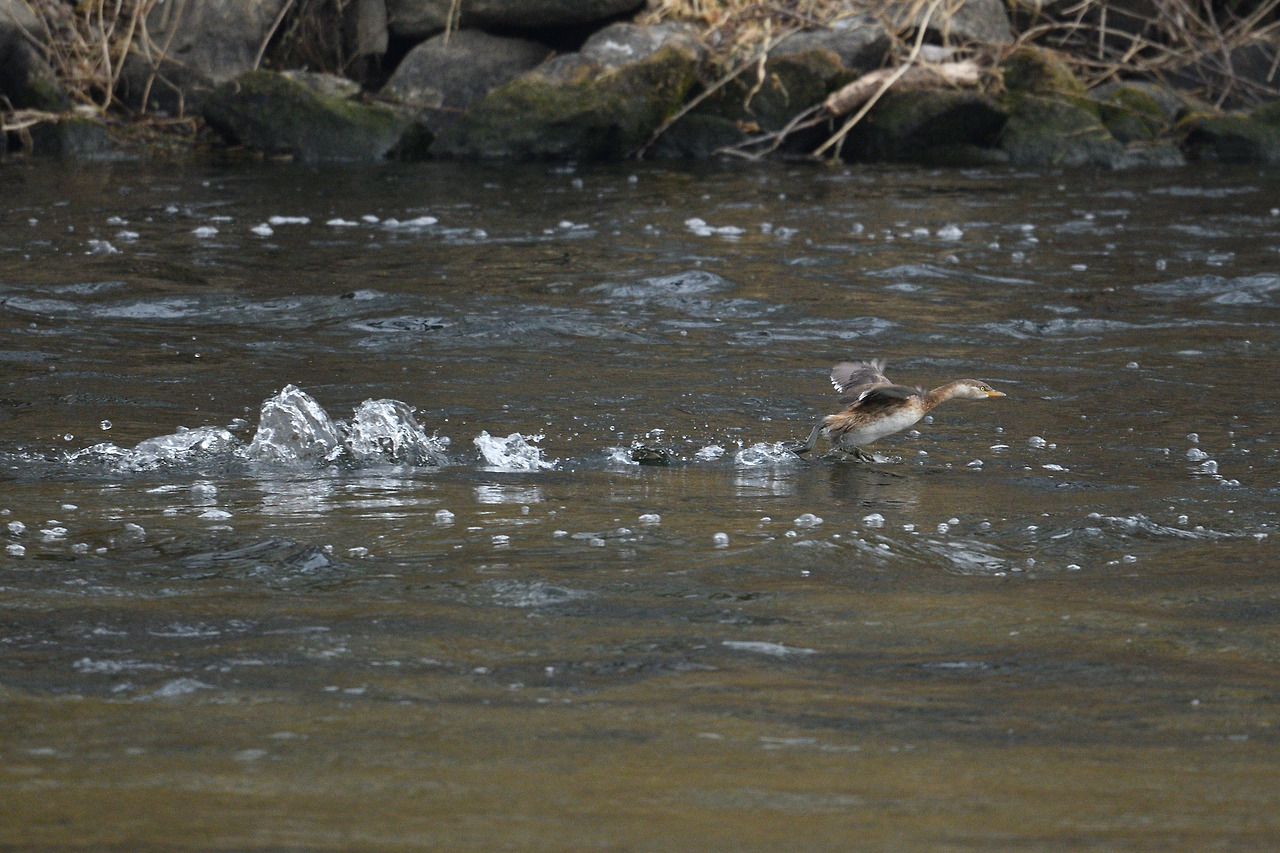 논병아리, 열심히 날아 고기 잡을 곳으로...