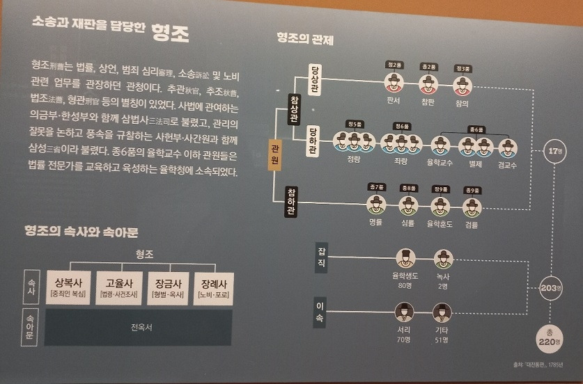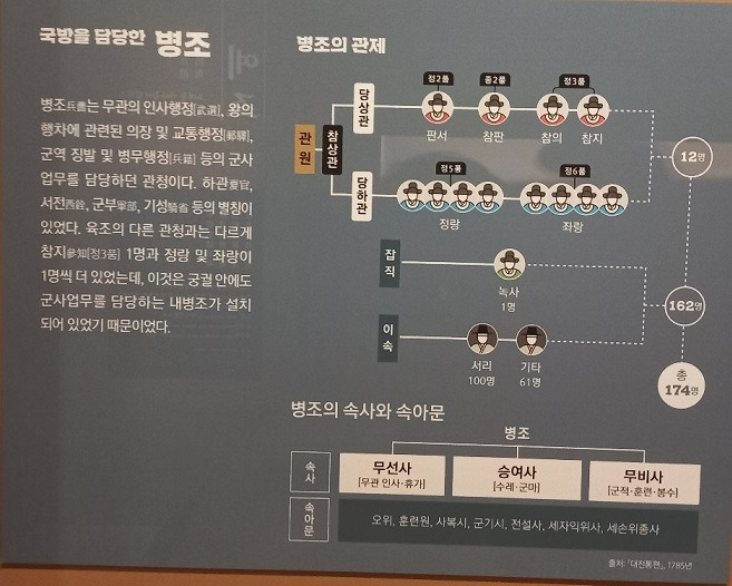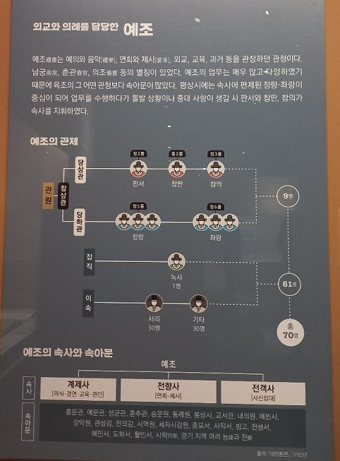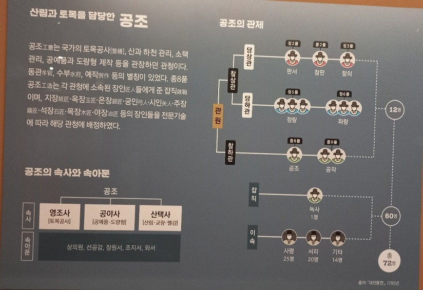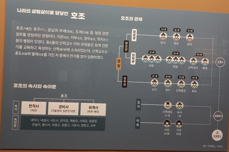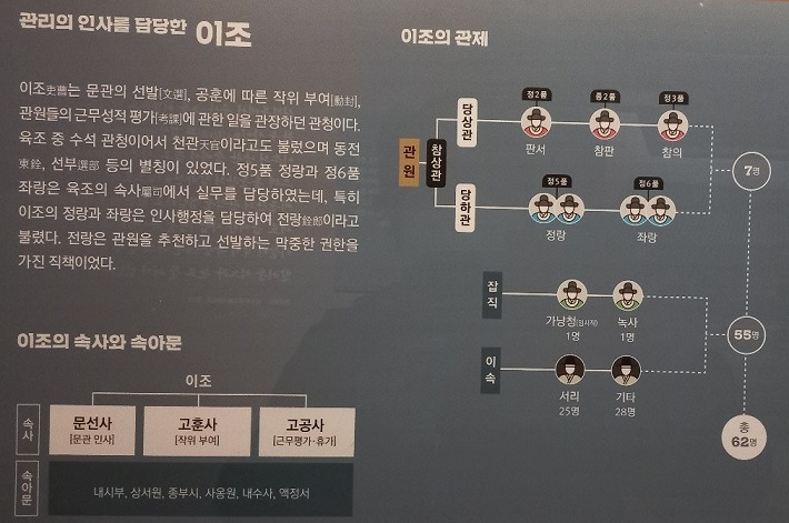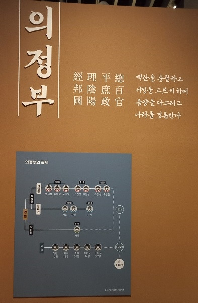 의정부는 관원을 통솔하고 정사를 총괄하던 조선 시대 최고의 행정 관청이었다. 그리고 관리의 인사를 담당한 이조, 나라의 살림살이를 담당한 호조, 외교와 의례를 담당한 예조, 국방을 담당한 병조, 소송과 재판을 담당한 형조, 살림과 토목을 담당한 공조, 관헌에 대한 감찰을 담당한 사헌부, 국가 원로의 예우를 담당한 기로소가 있으며, 한성부는 오늘날 서울시청과 같은 역할의 관청이었다고 한다. 중추부에 대한 설명은 없었던 것으로 기억되어 찾아보니, 특정한 관장 사항이 없이 문무의 당상관으로서 소임이 없는 자들을 소속시켜 대우하던 기관이라고 한다. 그리고 각각의 관청의 자세한 업무 내용과 관제에 대해 자세하게 설명되어 있었다.