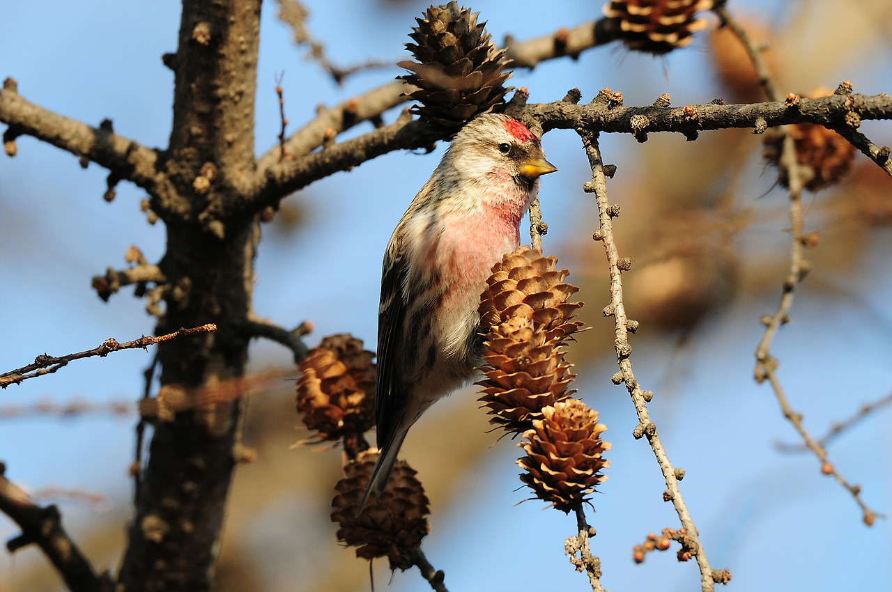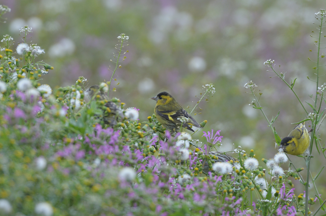 한국에서는 전국에 겨울새로 찾아와서 산지 숲에서 무리 지어 산다. 수컷의 겨울 깃은 머리 위가 검고 뒷목·등·어깨 등의 윗면은 누런 녹색 바탕에 검은색 줄무늬가 있으며 아랫면은 노랗다. 암컷의 겨울 깃은 전체적으로 잿빛이 도는 연한 녹색이고 배는 희다. 먹이는 소나무 및 화본과 식물의 씨앗인데, 번식기에는 벌레도 잡아먹는다.