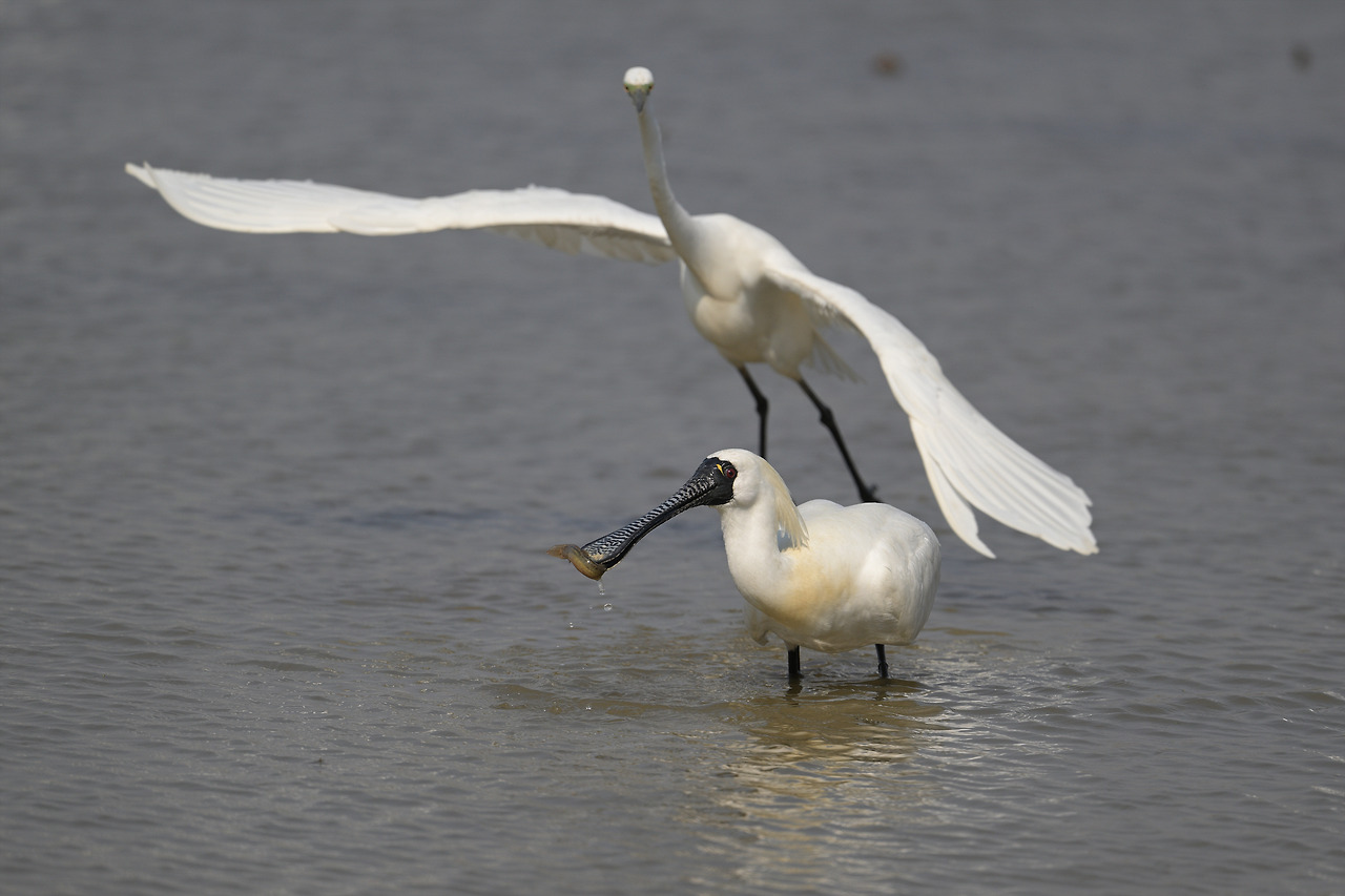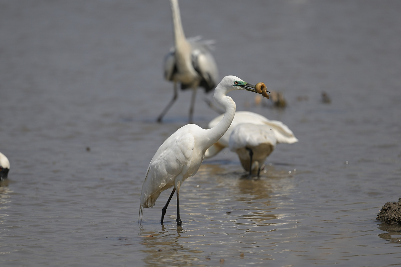 노랑부리저어새가 잡은 미꾸라지를 백로가...