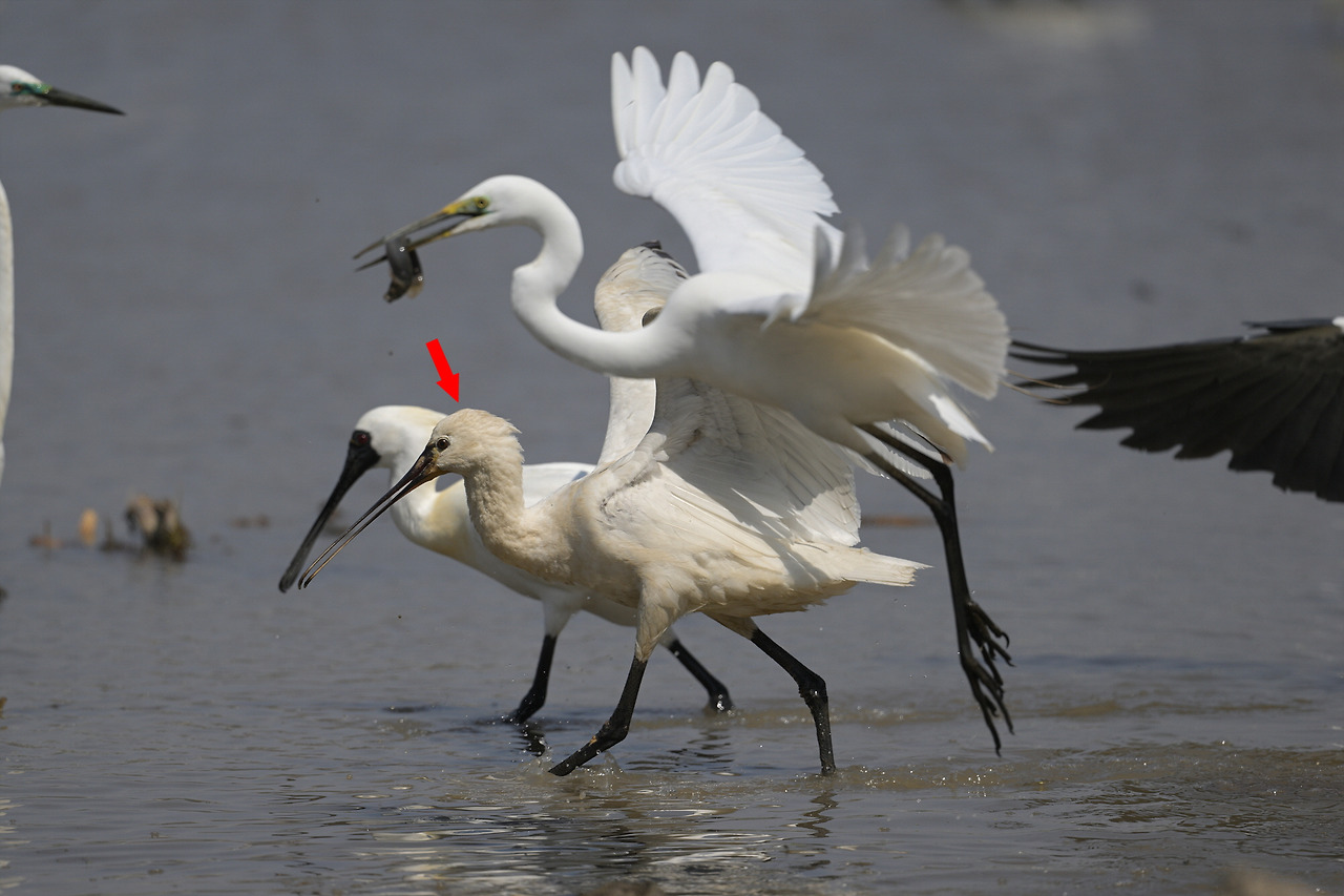 저어새가 잡은 미꾸라지를 뺏으러 달려드는 백로