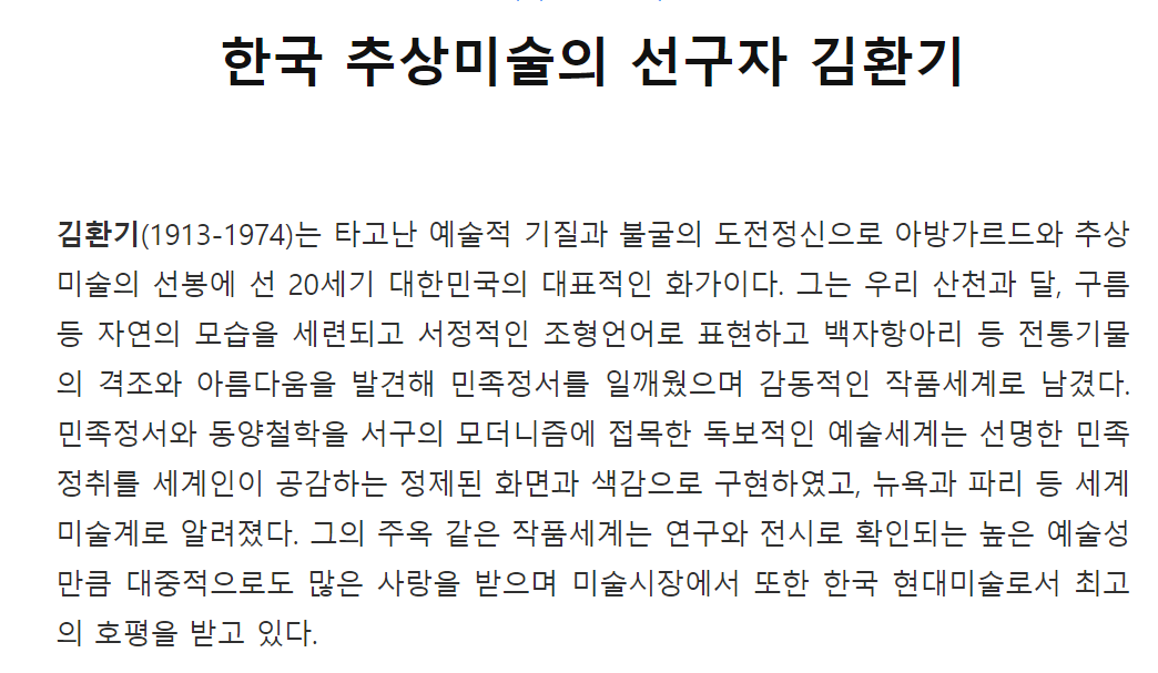 그리고 김환기 화백이 주로 사용한 색채를 보면 추상화인데도 한국적이라는 생각이 들었다. 한국적인 색을 섞어 그렸다고 할까? 초기에는 구상 작품이 많았지만 후기로 갈수록 추상 작품이 많았다.