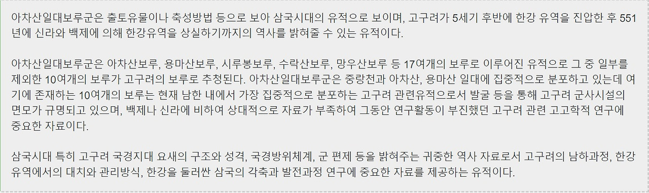 <서울특별시 광진구, 중랑구 노원구 및 경기도 구리시 일대에 걸쳐서 분포하고 있는 삼국시대 고구려의 보루군(堡壘群). 사적 제455호. 아차산을 중심으로 분포하고 있어 아차산 일대 보루군이라는 이름으로 명명되었다. 아차산 일대 보루군은 임진강 한탄강 유역 고구려 보루군에서 양주 분지 보루군을 거쳐 점진적으로 내려와 최종적으로 축조되는 보루군이다. 고구려는 일찍이 임진강과 한탄강 유역의 북변에 비교적 큰 보루들을 선점하면서 대 백제 전선을 남하시키는 데 성공한 것을 바탕으로 한강 유역까지 진출할 수 있었던 것으로 보고 있다. 아차산 일대의 보루들 중에서는 관청에만 사용되는 와당이 확인되고 있어서 다른 지역에서는 대형 성곽이 수행하였을 행정적 치소 역할을 했던 것을 대신하였다고 보기도 한다. 전략적 요충지였다고 할 수 있다.(나무위키)>