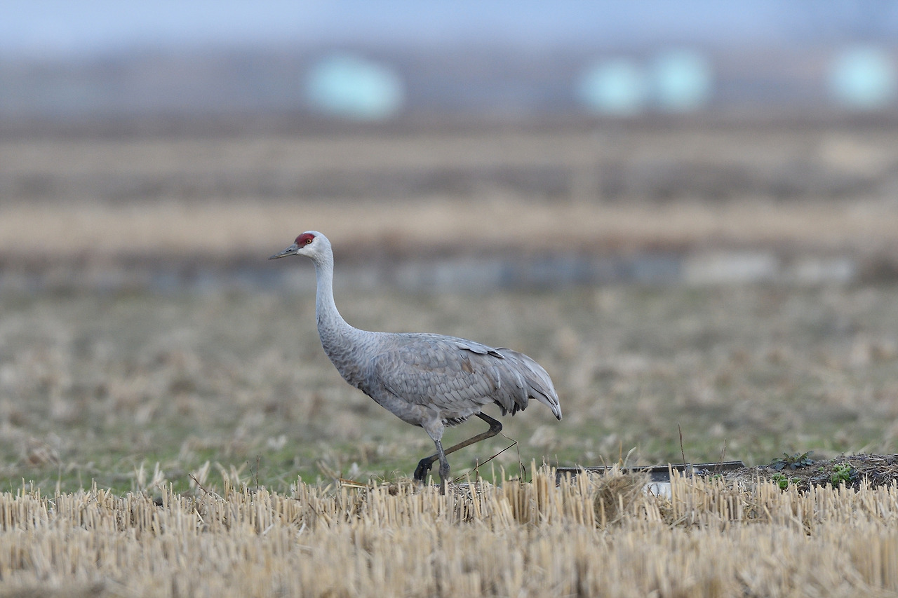 벼를 베어 낸 논에서 다른 두루미들과 함께 있는 캐나다두루미(2021년 3월 서산)