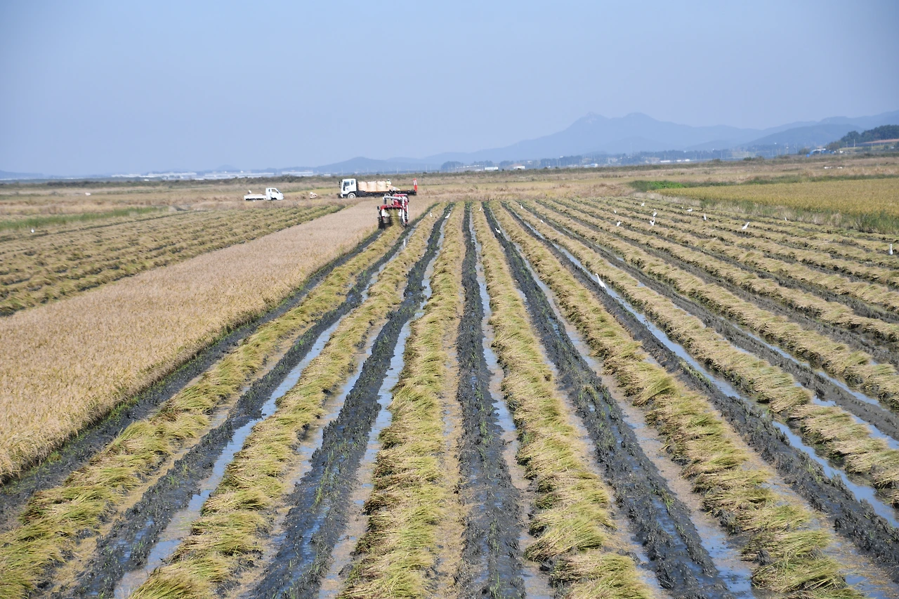 천수만에서 추수하는 모습