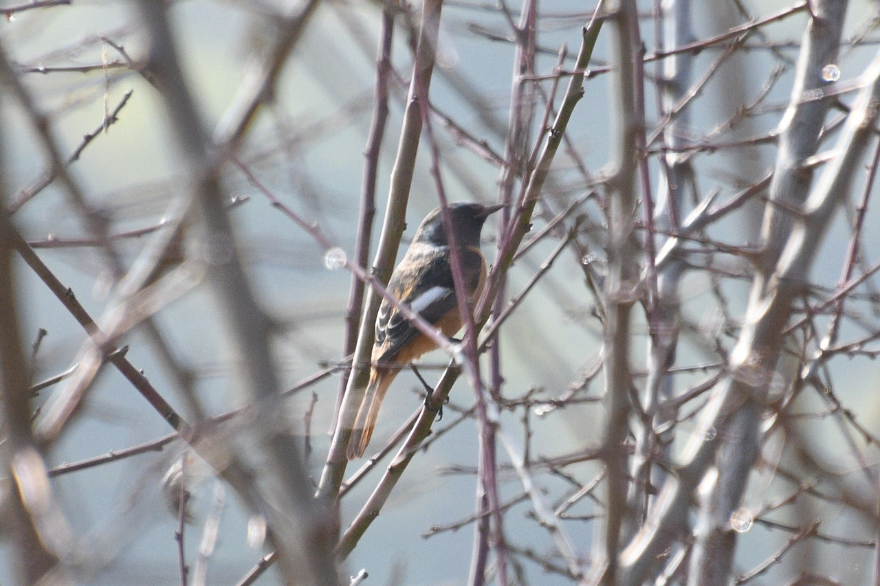 나뭇가지 사이에 숨은 딱새 수컷