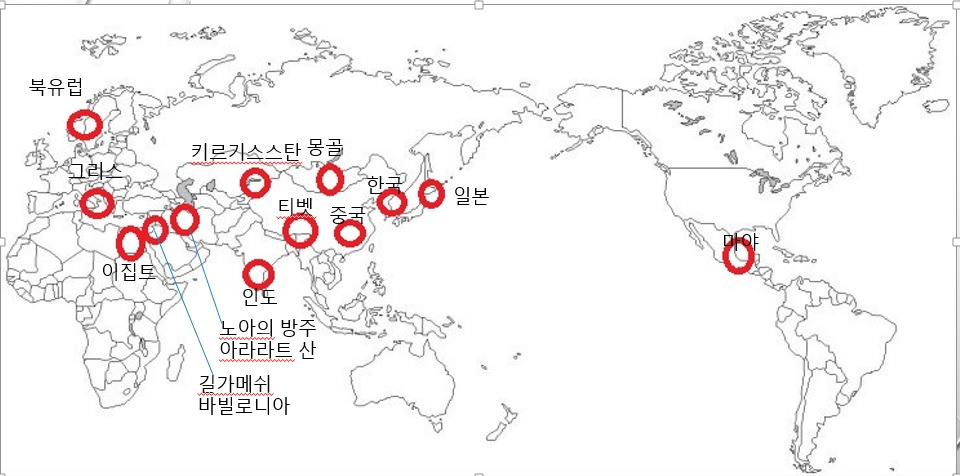여러 곳의 신화를 공부하면서 '신화가 왜 재미있을까?'를 생각해 본 적이 있다. 여러 가지가 있겠지만 오늘은 멀리 떨어진 신화 사이에 비슷한 이야기가 보이는 것이 그 첫 번째 재미 중 하나라고 하겠다. 그중 홍수 이야기다.
