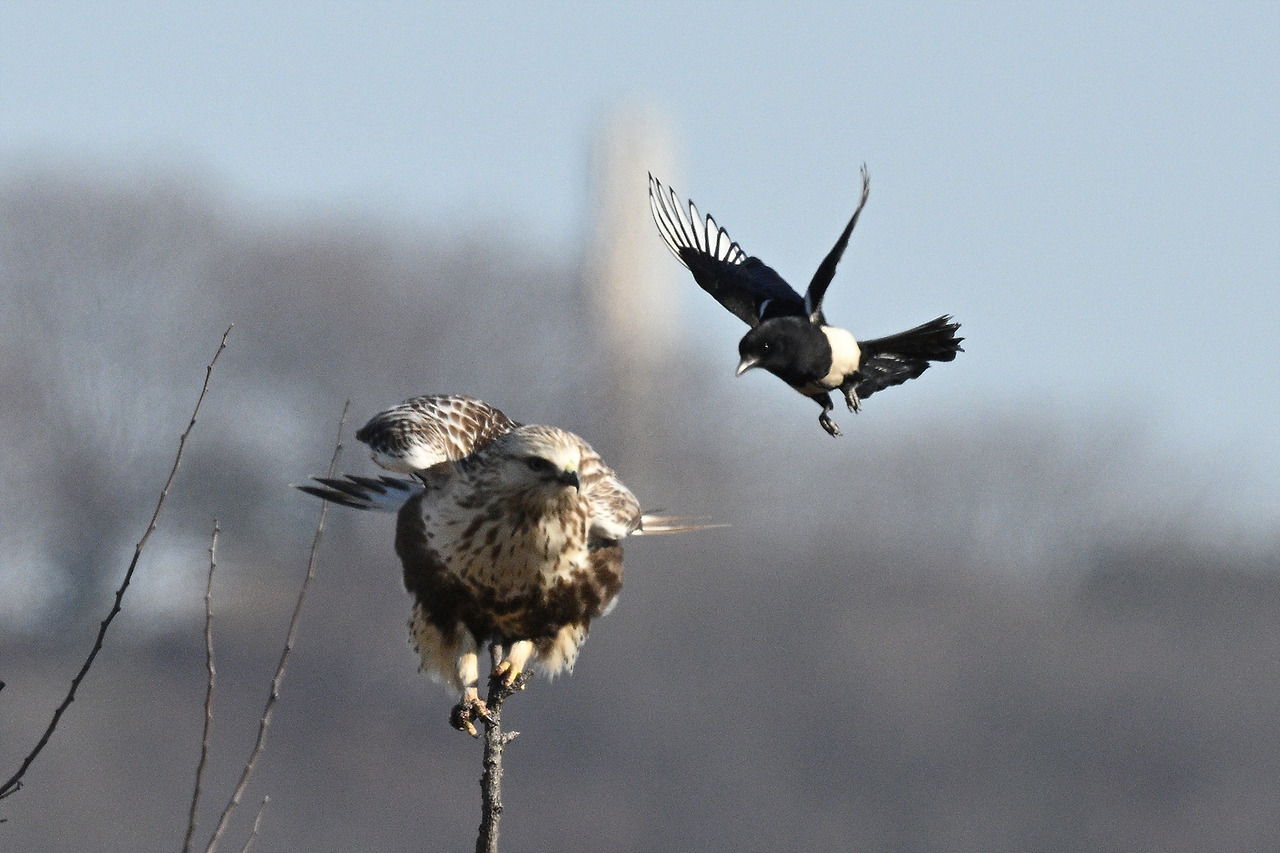 까치둥지 옆에 앉았다가 쫓겨나는 털발말똥가리