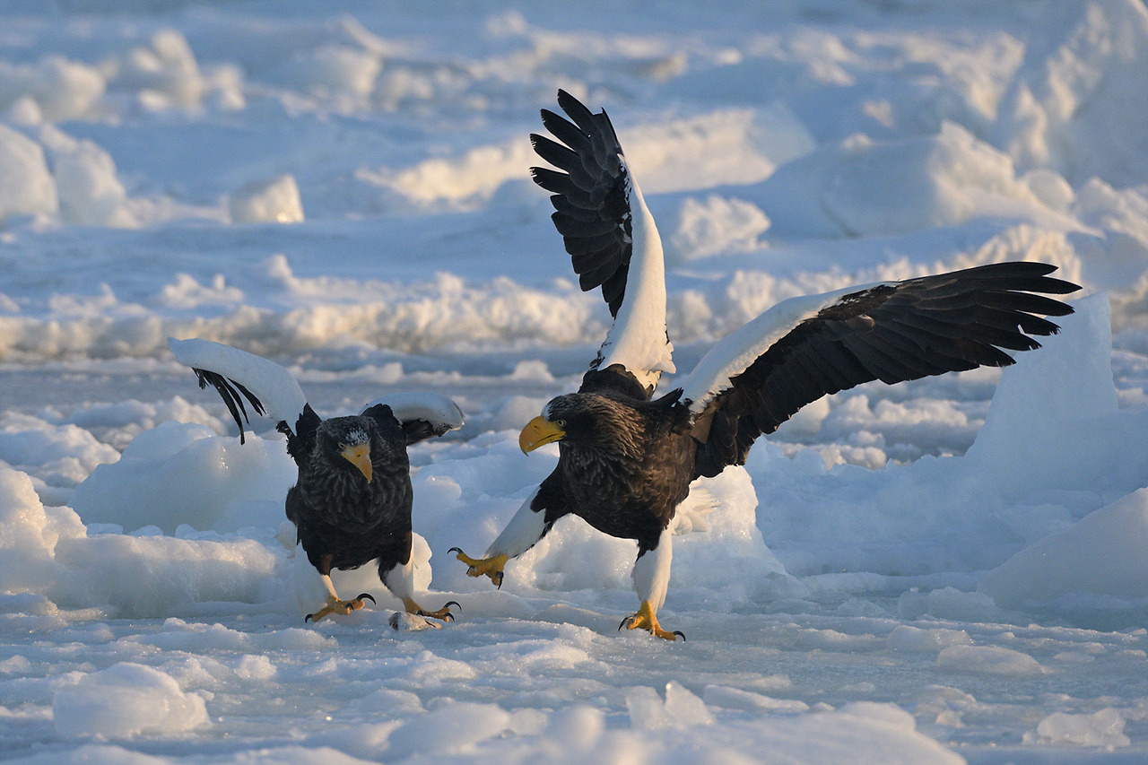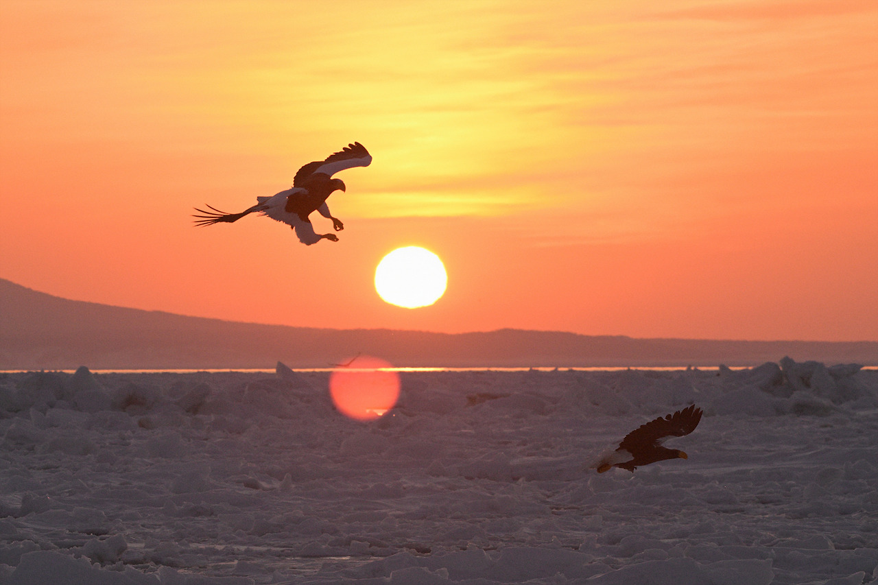 유빙을 뚫고 지나는 쇄빙선을 타고 바닷길을 20-30분 나가면 참수리 있는 곳에 도달하는데, 사진이 잘 나오는 각도로 배를 멈추고 물고기를 던지면 진사님들의 셔터 소리만 들을 수 있는데... 좋은 사진을 한 장이라도 더 찍으려고 벌이는 보이지 않는 전쟁터 같다는 말을 들었다.