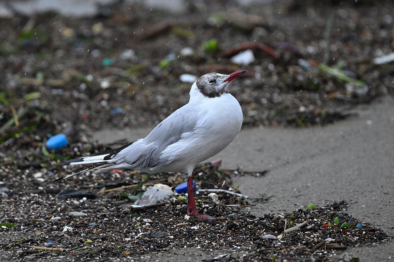 태풍에 떠내려온 부유물 속에서 먹이를 찾아 먹고
