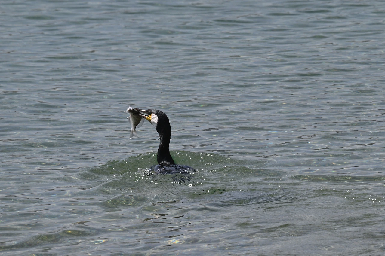 가마우지가 큰 물고기를 잡아 꿀꺽 삼켰다