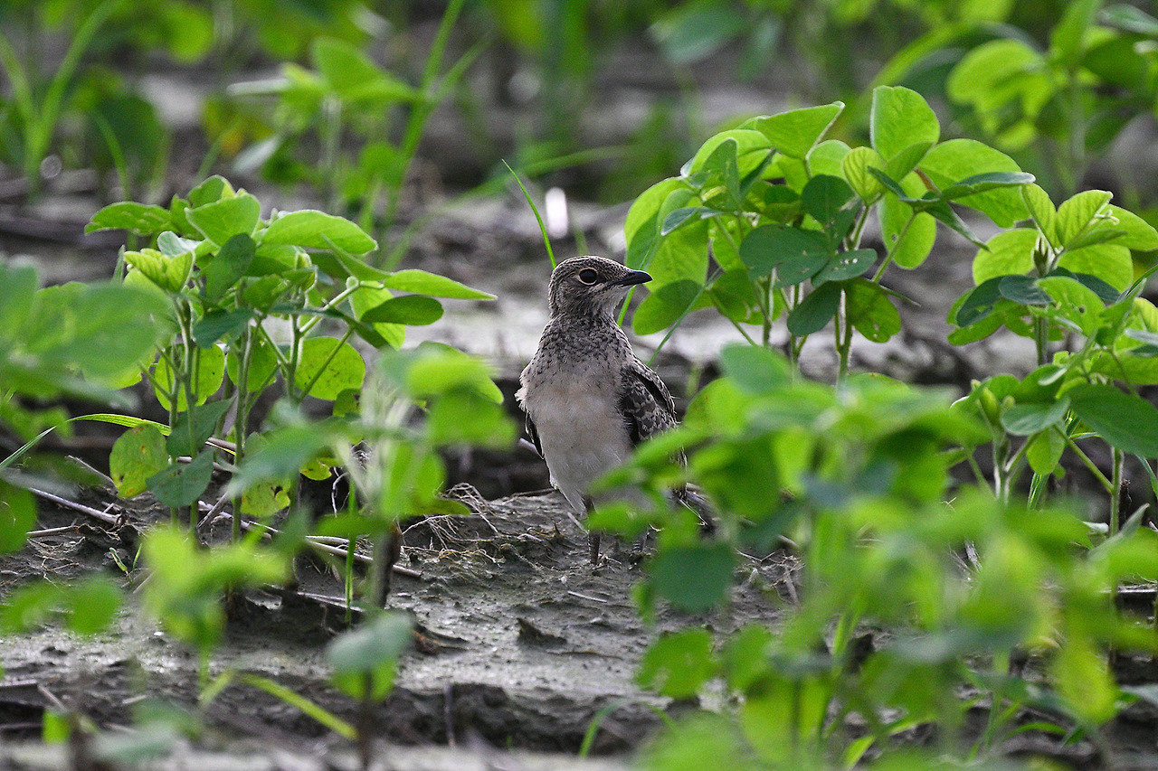 콩밭에 숨어있는 제비물떼새 새끼(성조는 없고, 어린 새만 두 마리...)
